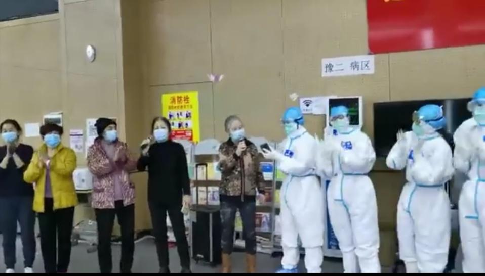 豫二病区当天还有病人23人,等待出院14人、转出9人。虽然是在方舱医院最后一天的值班,河南省中医院的王丽辉主任、张勤生主任和其他值班人员还是和往常一样早早来到方舱,为最后一批病人的出舱做好准备工作,没有丝毫的松懈。他们按时查房、询问病情、交代如何服药,以及院外注意事项,事无巨细均一一叮嘱。当天出院的093床的徐阿姨依旧是热情满满,用连声的谢谢表示对河南医疗队的感激之情。在院的患者和医护人员再次唱起了“学习雷锋好榜样”、“我和我的祖国”等歌曲,也有患者和往常一样,到了康复锻炼的时间,主动的打开电视播放“八段锦”等进行呼吸康复锻炼......即使是最后一天在方舱,医患之间仍一如往常。