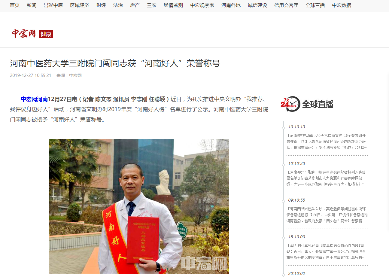 编者按:2019年12月27日,中宏网以《亚盈app(中国)官方网站三附院门闯同志获“河南好人”荣誉称号》为题,对我校三附院门闯同志获“河南好人”荣誉称号进行报道。现将全文刊发如下: