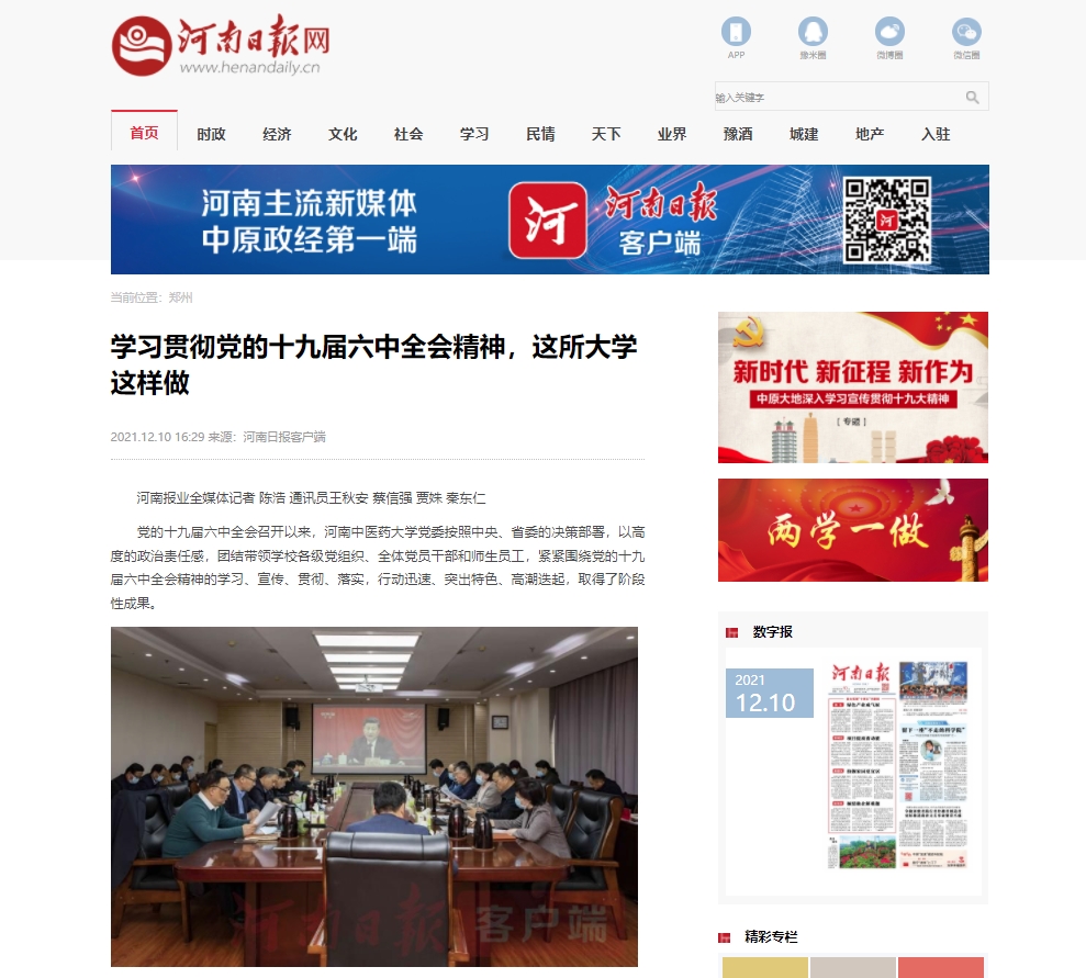 2021年12月10日,河南日报网对我校学习贯彻党的十九届六中全会精神进行报道。