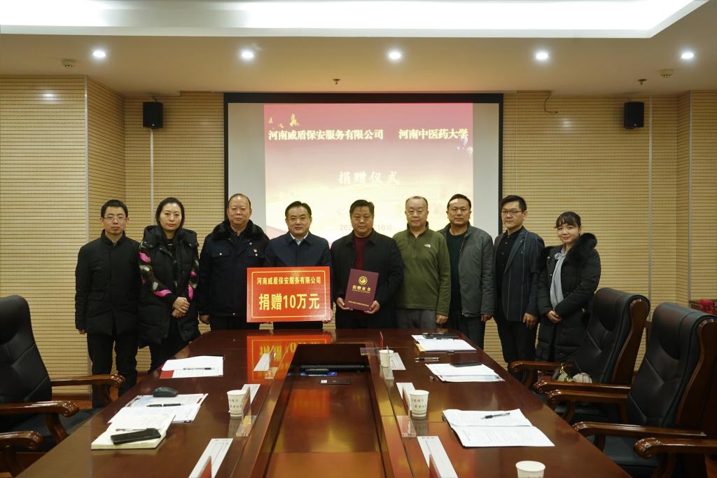 本网讯(文图/常征辉)2020年1月10日上午,河南威盾保安服务有限公司向我校教育发展基金会捐赠仪式成功举办。河南威盾保安服务有限公司董事长韦存山、我校校长办公室主任王剑锋及双方相关部门负责人参加仪式。校长办公室副主任张婷婷主持仪式。