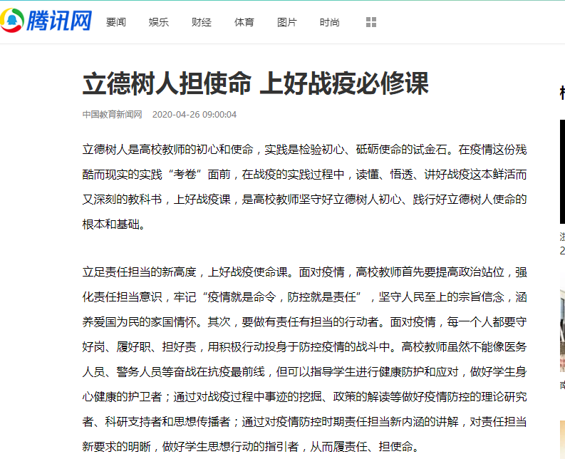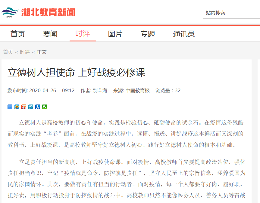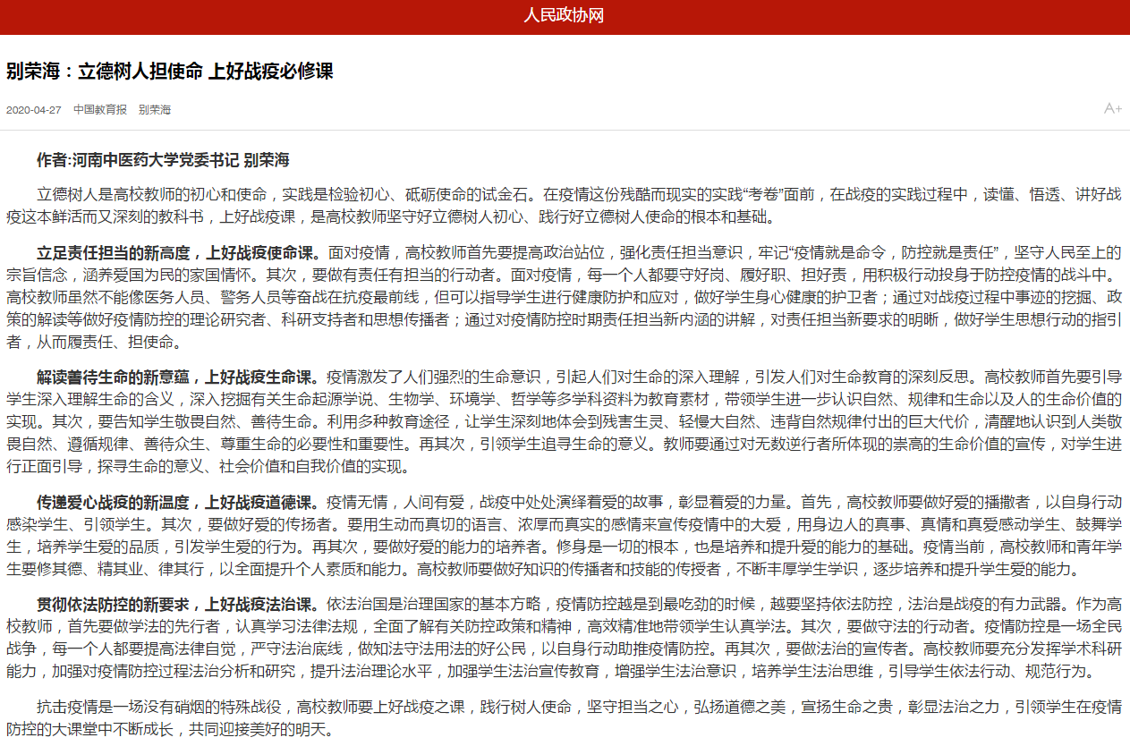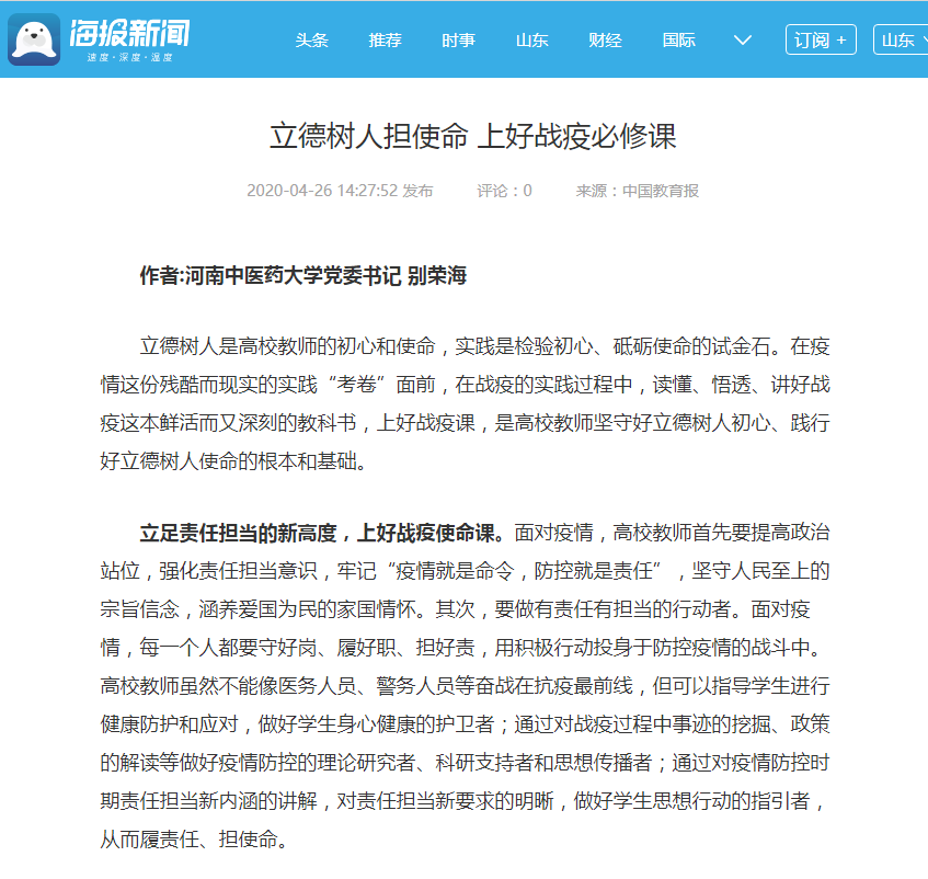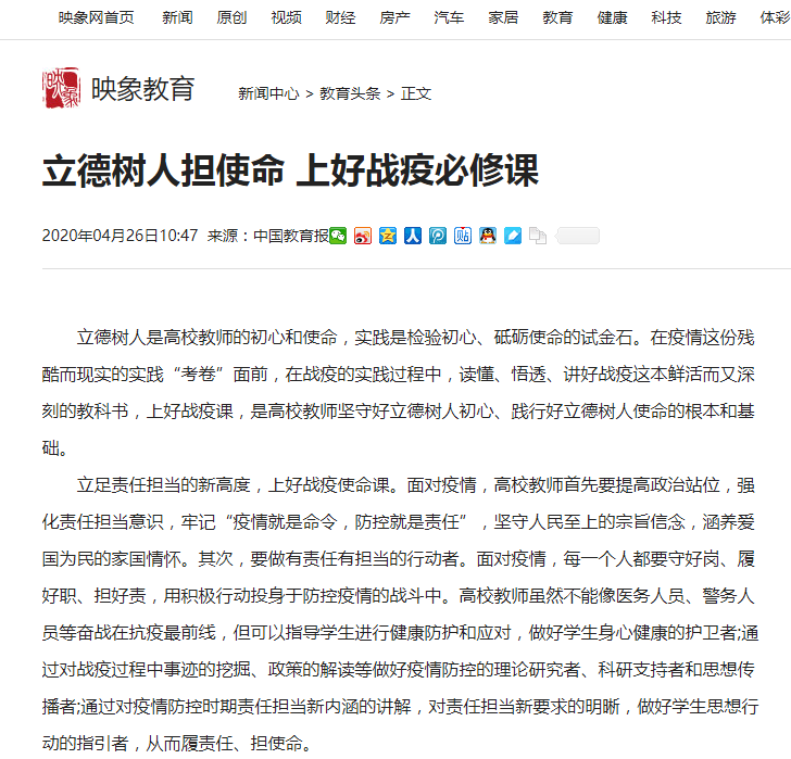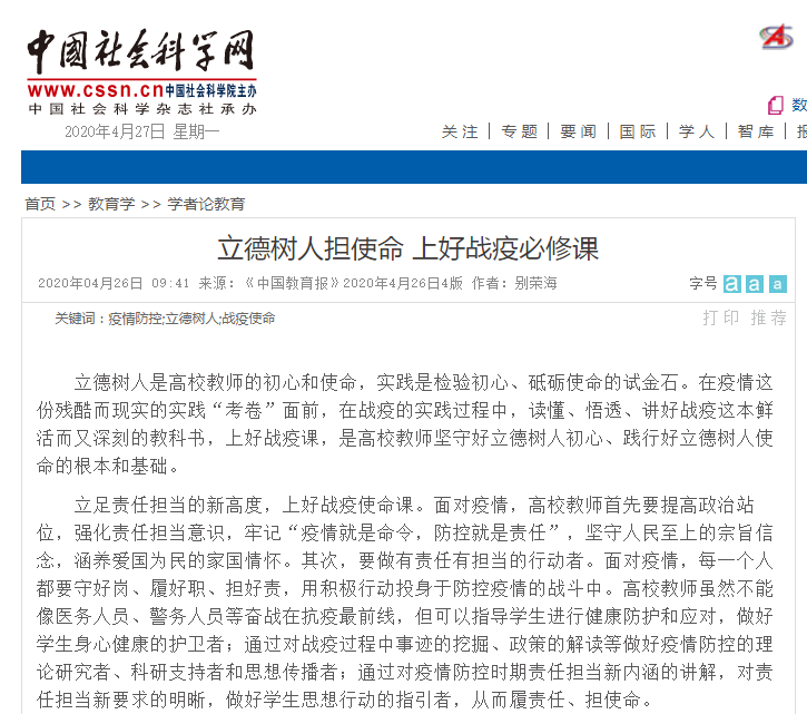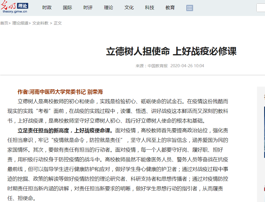 编者按:2020年4月26日,《中国教育报》以《立德树人担使命 上好战疫必修课》为题,从“立足责任担当的新高度,上好战疫使命课”“解读善待生命的新意蕴,上好战疫生命课”“传递爱心战疫的新温度,上好战疫道德课”“贯彻依法防控的新要求,上好战疫法治课”四个维度刊发了我校党委书记别荣海的理论文章,受到了中国教育新闻网、光明网、中国社会科学网、人民政协网、腾讯网、映象新闻、海报新闻等多家媒体的广泛关注与报道。