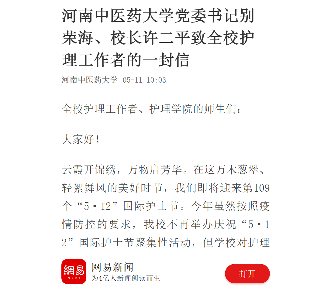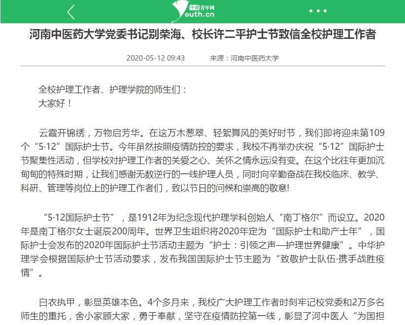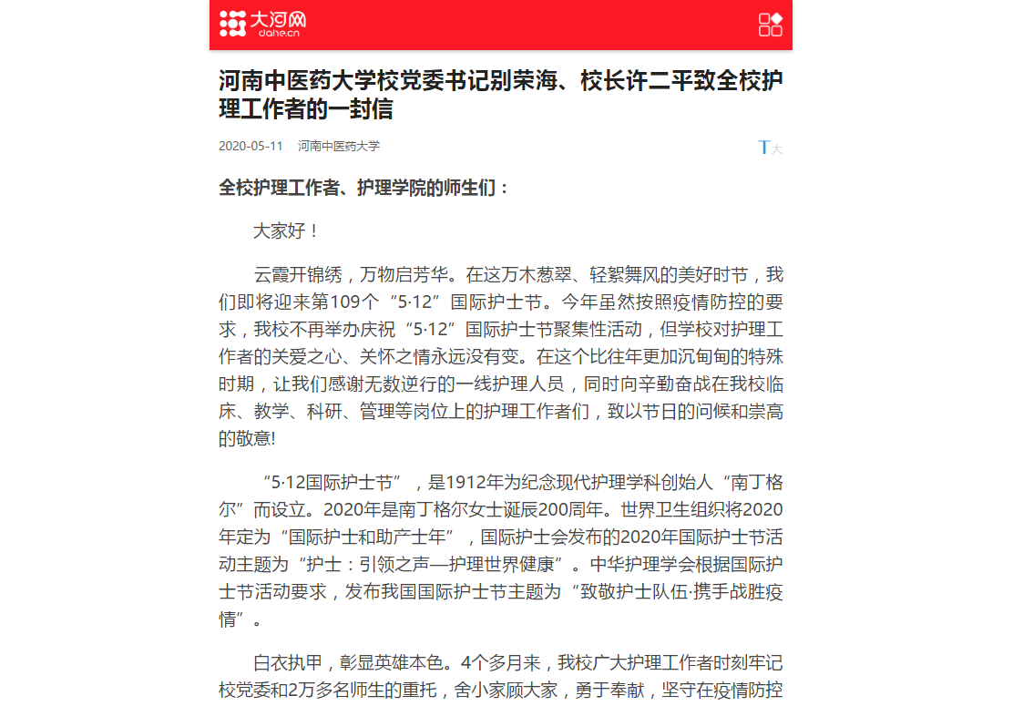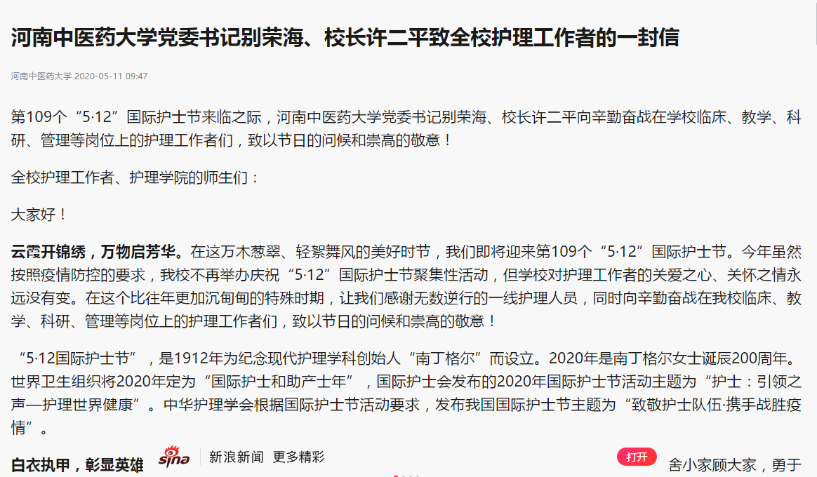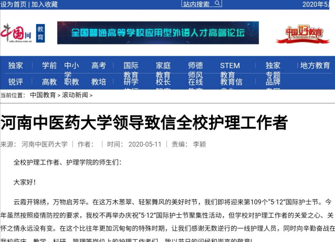 编者按:2020年5月11日-12日,中青网、中国网、环球网、大河网、网易新闻等媒体对我校党委书记别荣海、校长许二平致全校护理工作者的一封信进行报道。