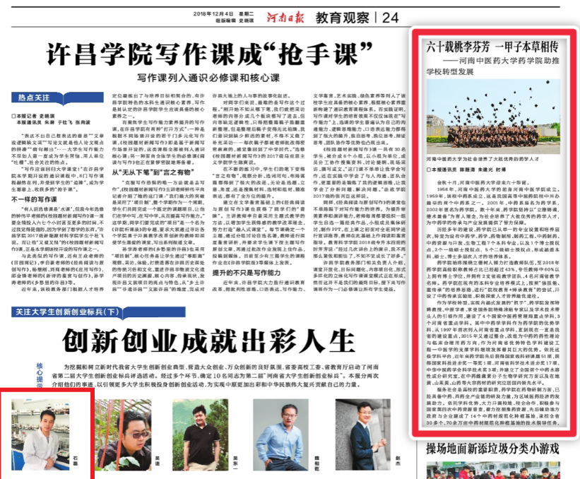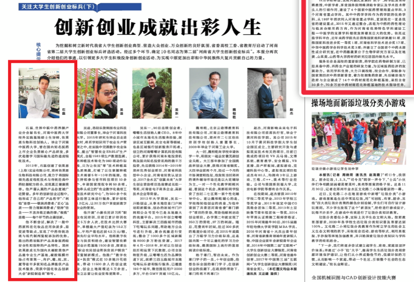 《河南日报》在同一版,以“创新创业成就出彩人生”为题,对我校药学院优秀毕业生石磊,即“第二届河南省大学生创新创业标兵”的先进事迹进行了报道。