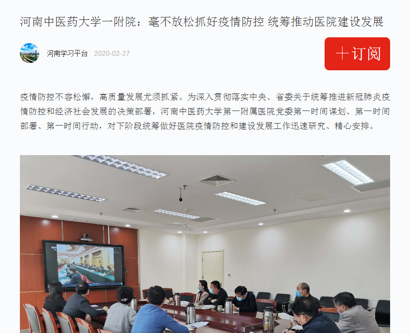 编者按:2020年2月27日,学习强国对我校一附院毫不放松抓好疫情防控,统筹推动医院建设发展进行报道。现将全文刊发如下: