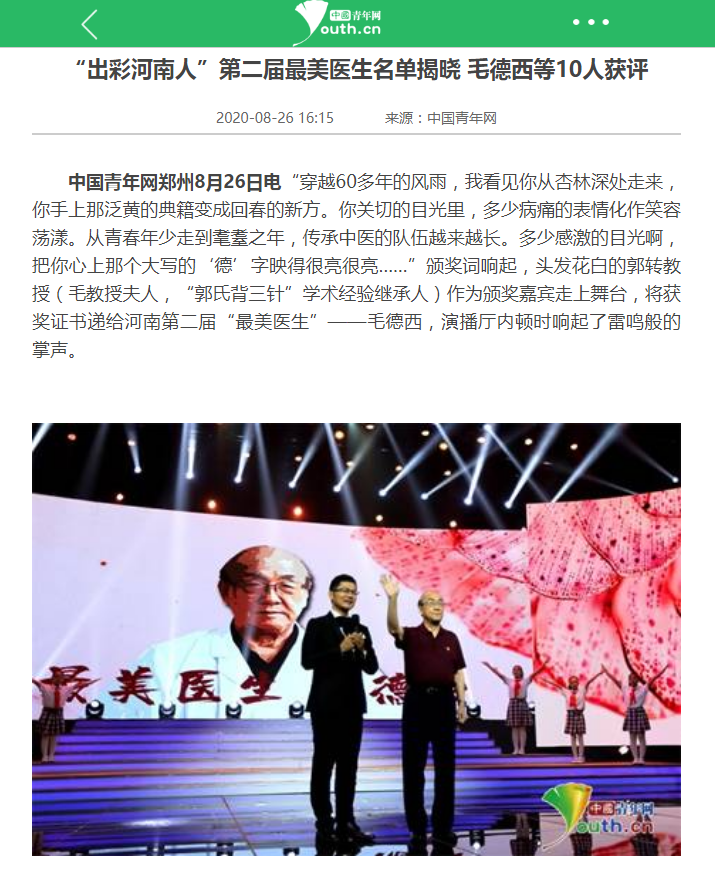 2020年8月25日,中青网对我校毛德西教授获评“出彩河南人”第二届最美医生进行报道。