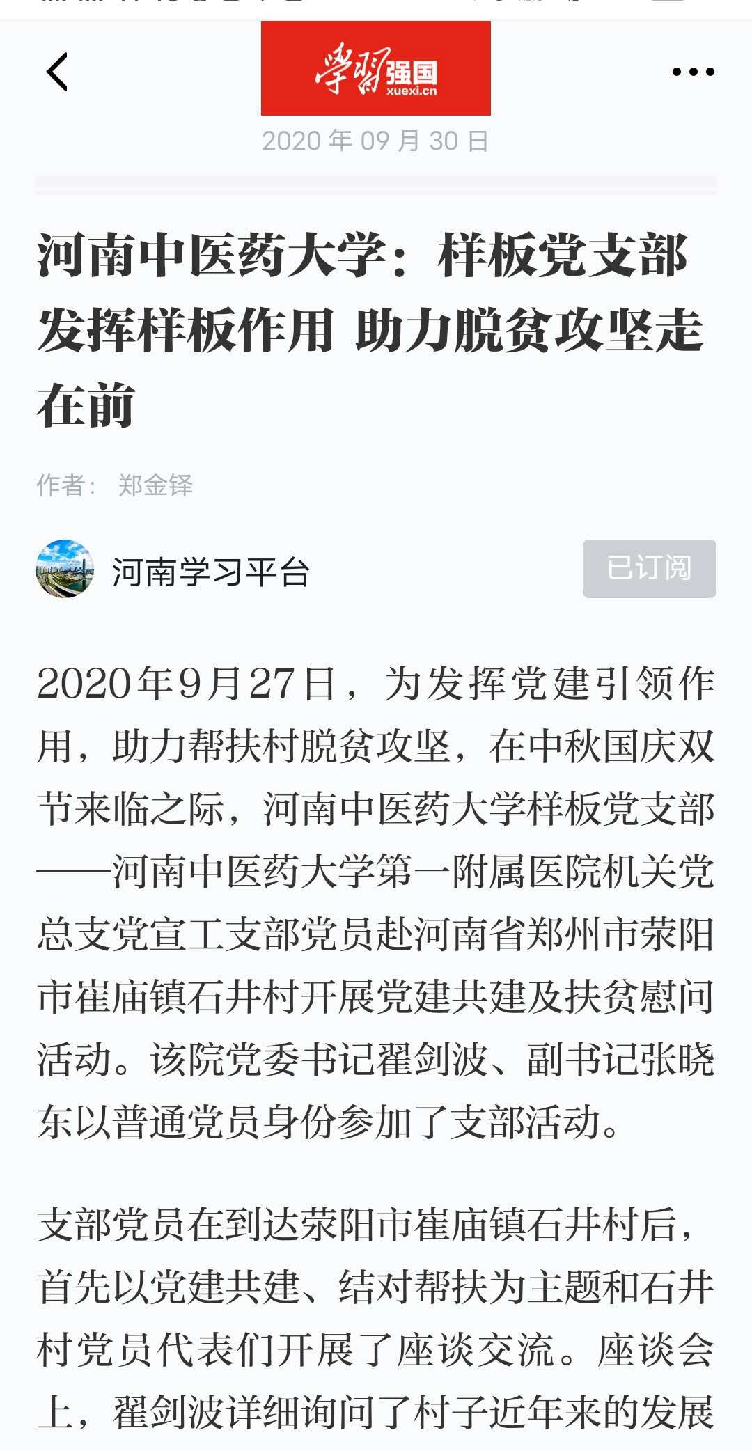 编者按:2020年9月30日,“学习强国”学习平台以《亚盈app(中国)官方网站:样板党支部发挥样板作用 助力脱贫攻坚走在前》为题,对我校样板党支部——一附院机关党总支党宣工支部进行报道。现发布如下: