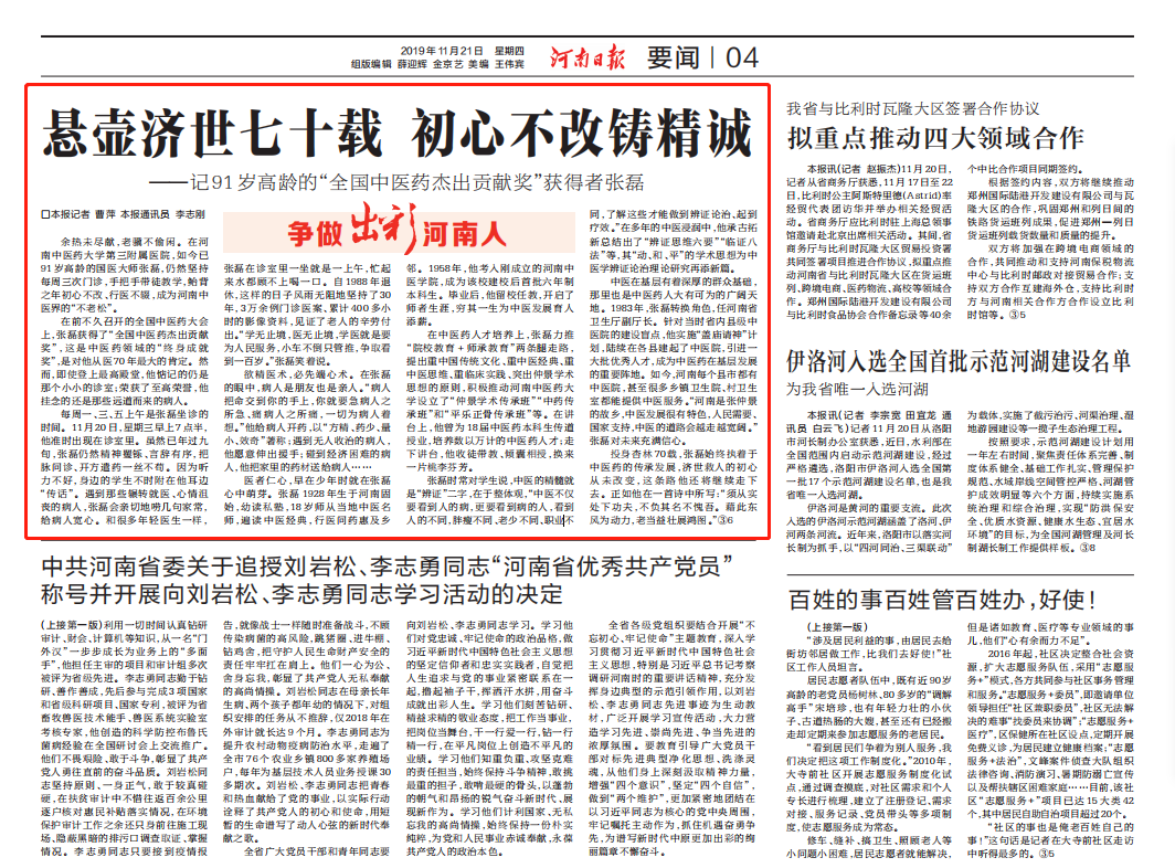 编者按:2019年11月21日,河南日报以《悬壶济世七十载 初心不改铸精诚》为题,对我校“全国中医药杰出贡献奖”获得者国医大师张磊教授的先进事迹进行报道。现将全文刊发如下: