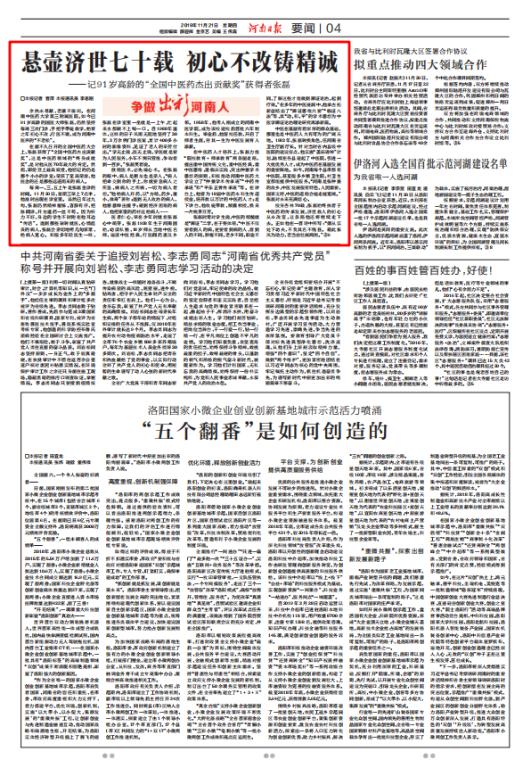 河南日报《悬壶济世七十载 初心不改铸精诚》