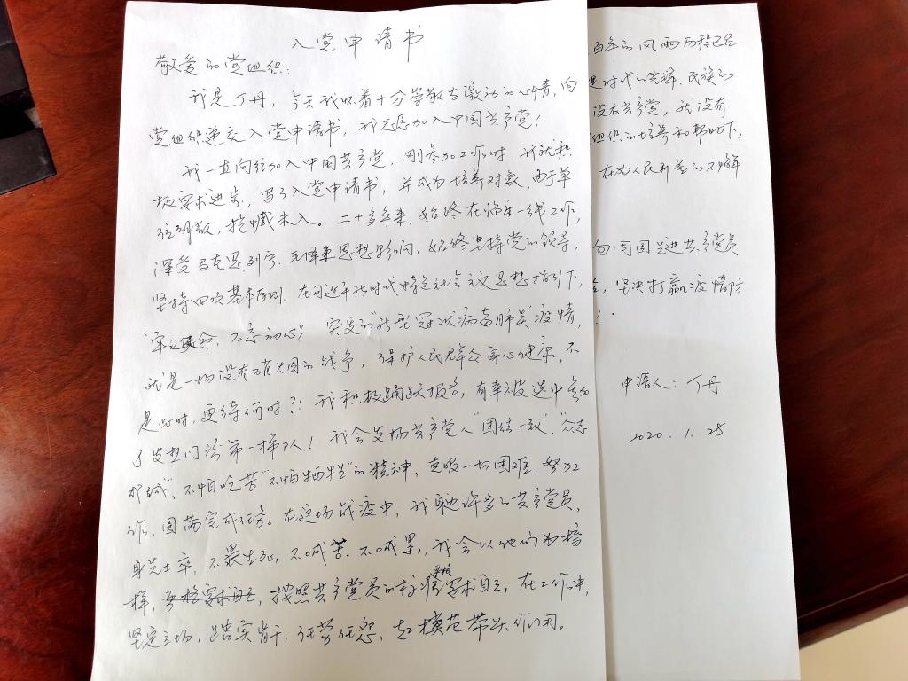 “我是丁丹,今天我怀着十分崇敬与激动的心情,向党组织递交入党申请书,我志愿加入中国共产党!”