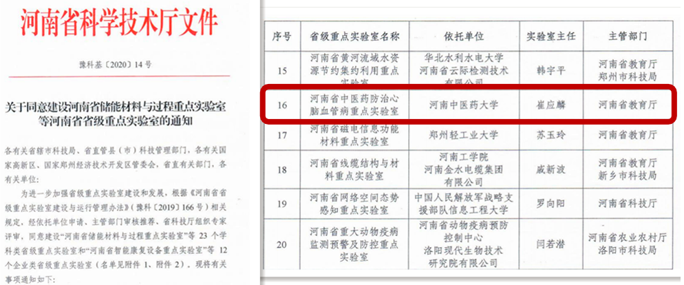 本网讯(文图/张俊霞)近日,河南省科技厅发布《关于同意建设河南省储能材料与过程重点实验室等河南省省级重点实验室的通知》,由我校第二附属医院崔应麟院长主持,中医药科学院牵头申报的“河南省中医药防治心脑血管病重点实验室”成功获批组建,成为我校第六个省级重点实验室。