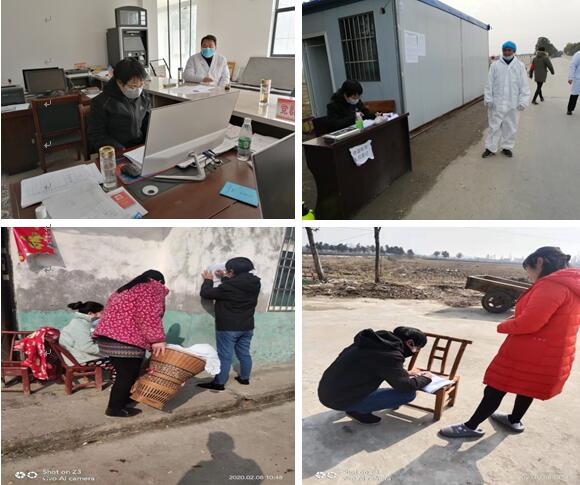2018级针灸推拿学院专升本四班杨佩钰,在河南省商丘市睢县尚屯镇老庄村委路口,配合着当地工作人员严控进出车辆,测量体温,记录信息,同时为当地人员讲述防疫知识。