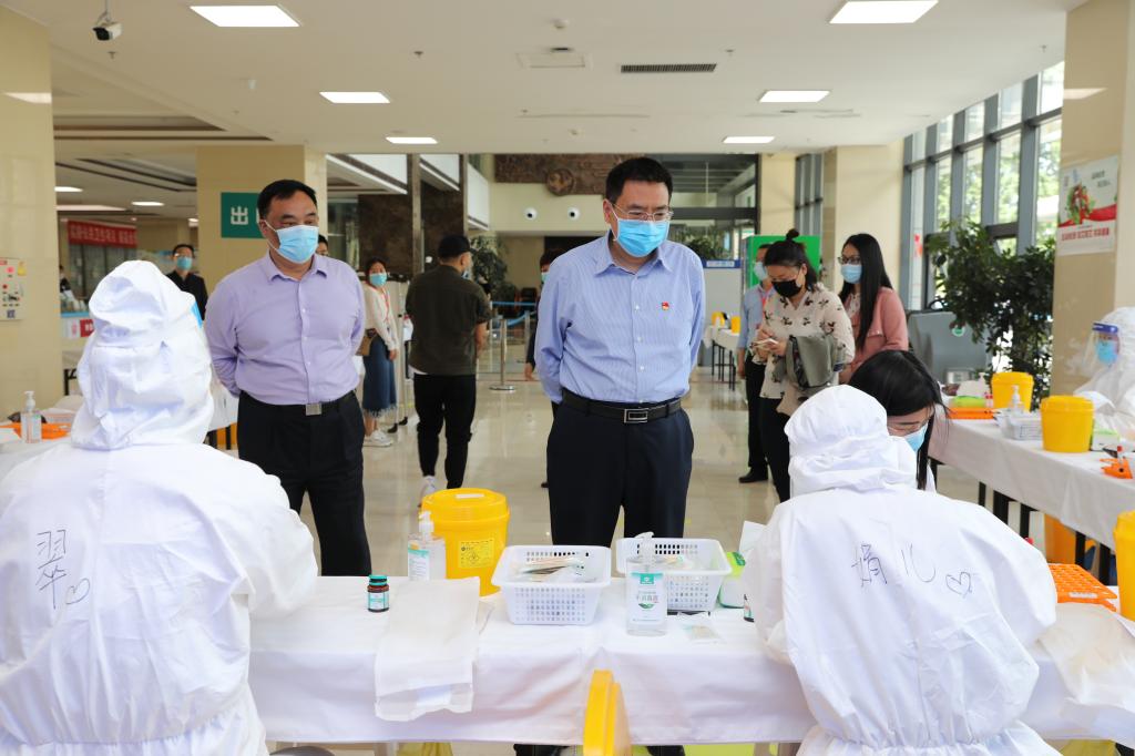 全体校领导一早就来到我校第一附属医院龙子湖院区,迎接同学们的归来,并详细了解报到现场疫情防控措施的落实情况,仔细查看同学们行李消杀、扫码登记、体温测量、健康筛查、资格审查、信息核对等工作的开展,通过学校“今日校园”大数据平台,实时掌握学生报到情况。在健康筛查结果等候区,校领导一行与来自新疆的阿仁同学亲切交谈,询问他的返校路径、入学后的心理调适、对学校防控措施的了解、返校后学习生活准备等情况,希望他能够珍惜宝贵的校园学习时光,做好毕业相关准备工作,为顺利毕业奠定坚实基础。