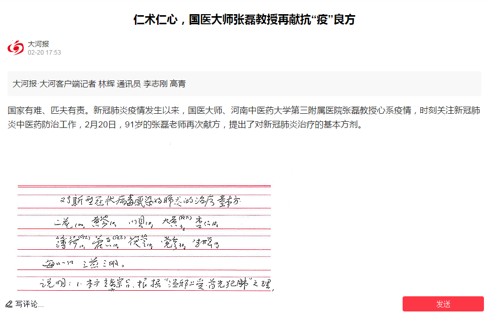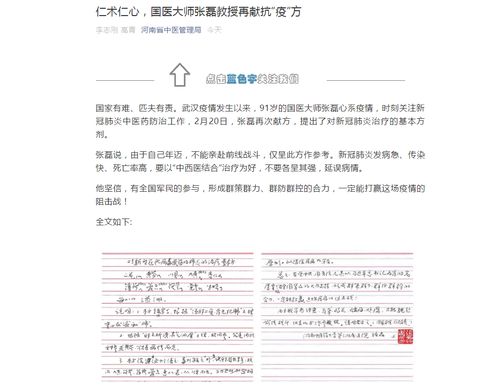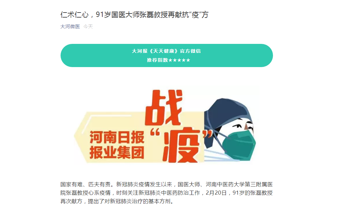 编者按:2020年2月20日,河南省中医管理局官方微信、大河报、大河微医公众号等媒体对我校国医大师张磊教授再献抗“疫”良方进行报道。现将大河报全文刊发如下: