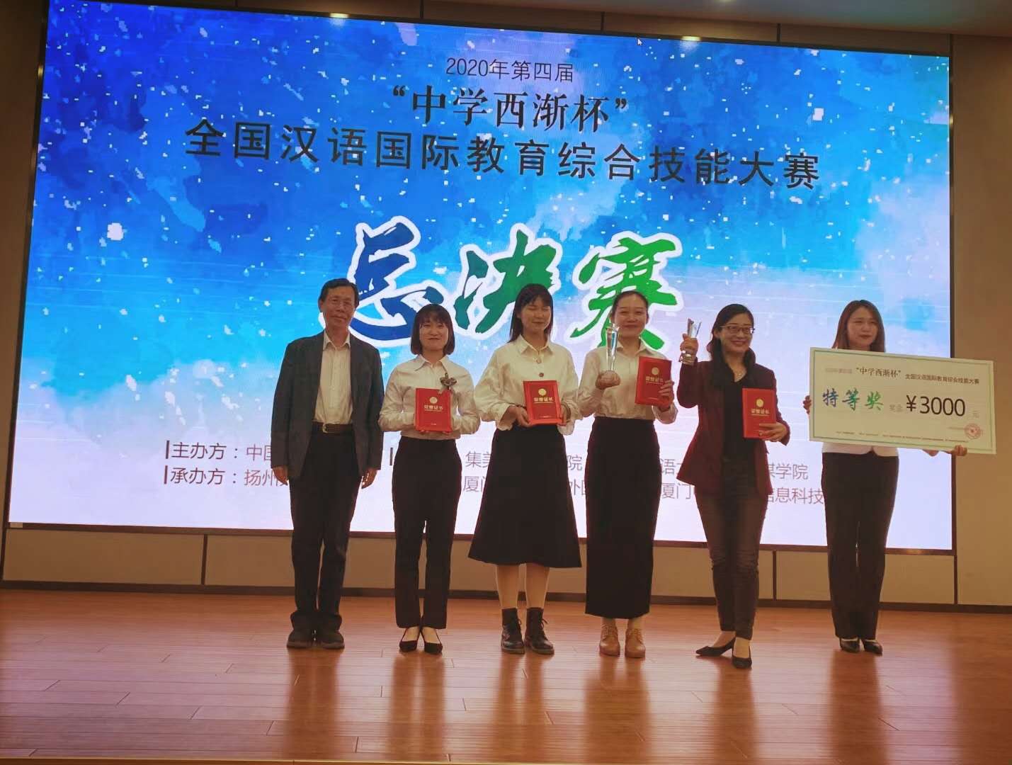 本网讯(文图/马笑峰)2020年11月8日,第四届“中学西渐杯”全国汉语国际教育综合技能大赛在扬州大学成功举行,我校外语学院汉语国际教育专业学生团队积极准备、团结协作,凭借优异的表现荣获总决赛特等奖,展现了河中医学子扎实的专业素养和良好的综合素质。