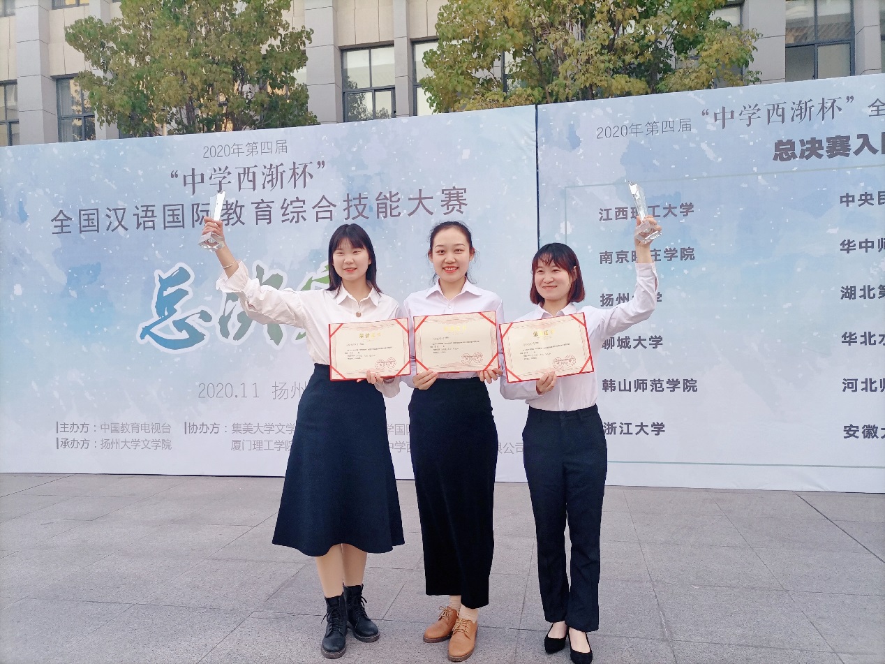 “中学西渐杯”全国汉语国际教育综合技能大赛是汉语国际教育专业具有影响力的国家级专业能力竞赛。本次比赛分理论考核、现场演讲、教学展示和中英文答辩等多个项目,体现了汉语国际教育理论性与实践性有机结合的专业特点。从初赛报名开始,外语学院高度重视,经过老师们的精心指导和学生们的团结协作,我校在初赛的全国77所高校中突出重围,喜获晋级总决赛的资格,与浙江大学、华中师范大学等18所高校选手同场竞技。决赛过程中,由汉语国际教育专业17级乔丹妮、贾怡涵,18级高远三位同学组成的团队凭借夯实的知识储备和精彩的现场展示,经过四个环节的激烈角逐,赢得了评委及各参赛团队的一致好评,最终脱颖而出,勇夺大赛特等奖。