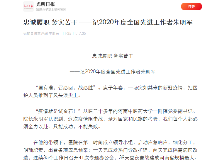 编者按:2020年11月25日,光明日报对我校一附院院长朱明军荣获2020年度全国先进工作者进行报道。现将全文刊发如下: