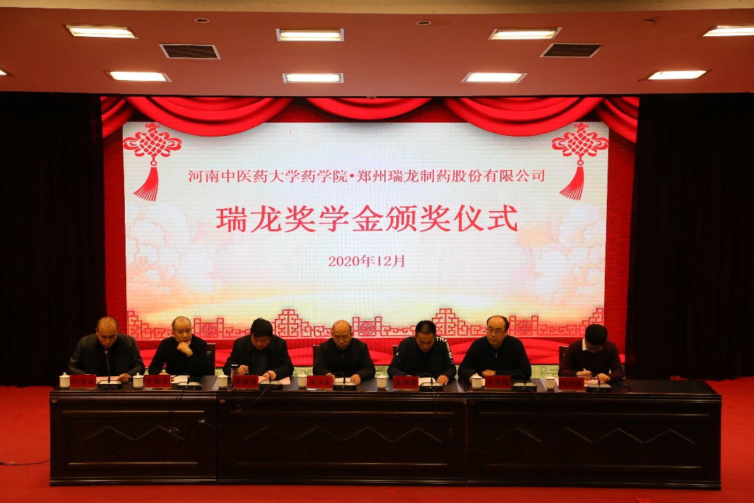 本网讯(图/王英平 杜玲玉 文/杨可欣 高巍)为加强校企合作,培养中医药优秀人才,2020年12月14日下午,我校举行瑞龙奖学金颁奖仪式,郑州瑞龙制药股份有限公司总经理王洪涛、副总经理辛大刚、牛金永,我校副校长冯卫生,药学院相关负责人、辅导员及学生代表参加典礼。颁奖典礼由药学院副院长纪宝玉主持。