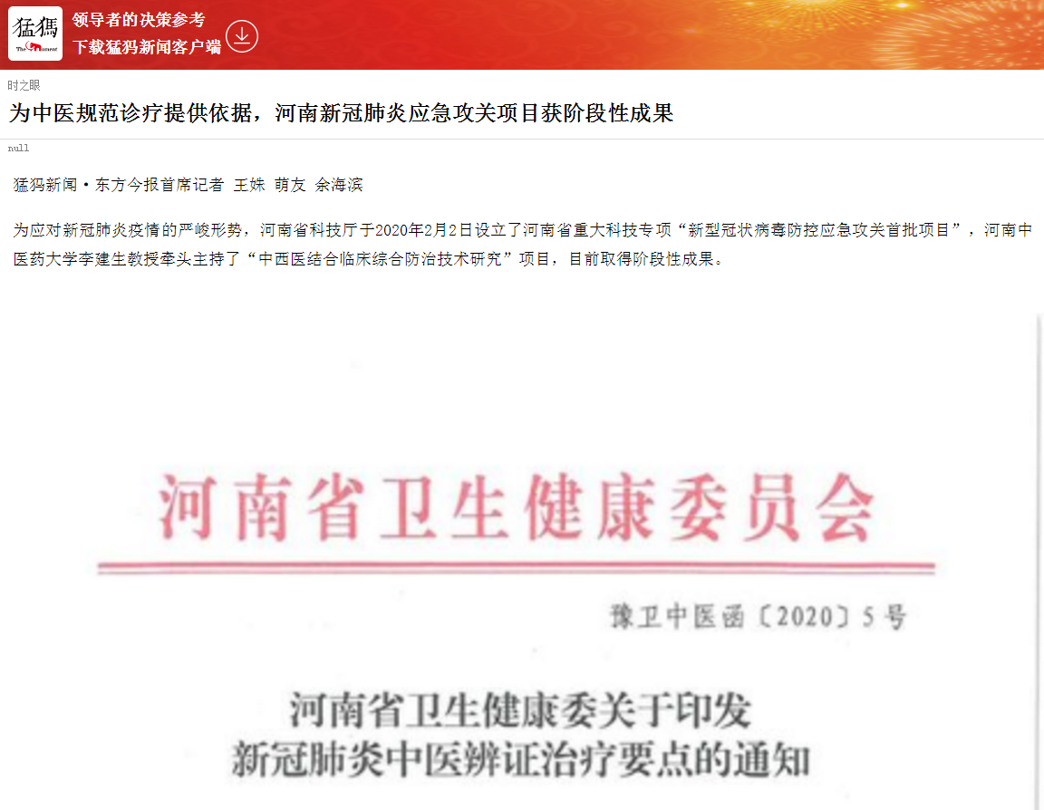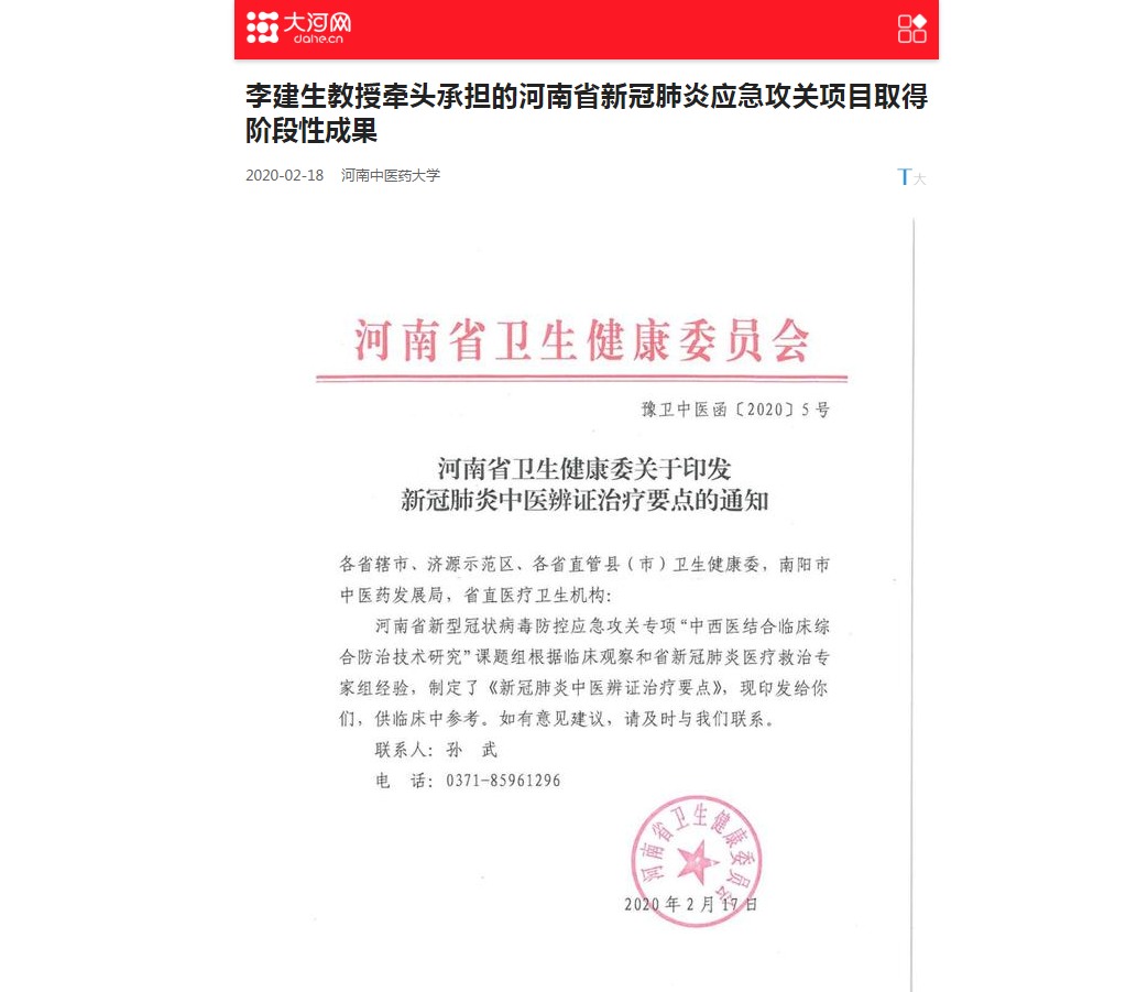 李建生教授牵头承担的河南省新冠肺炎应急攻关项目取得阶段性成果