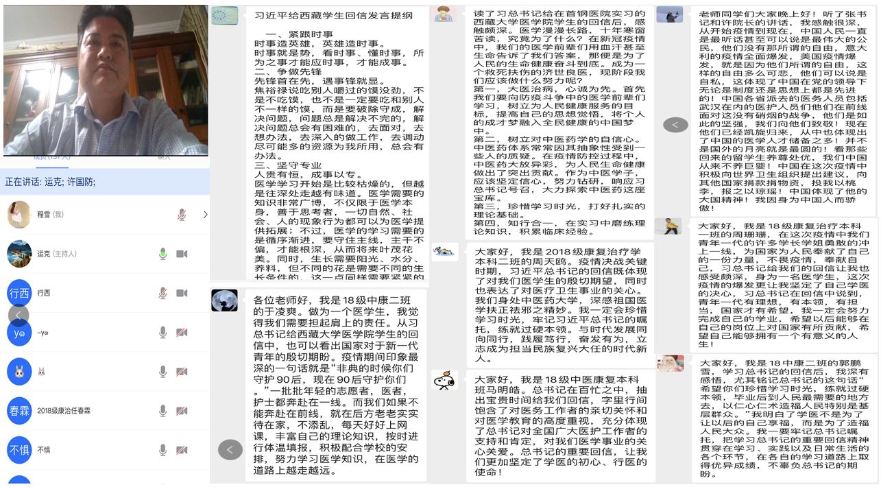 本网讯(文图/程雪 步家铭)藏历新年前夕,习近平总书记给在北京大学首钢医院实习的西藏大学医学院17名临床医学专业本科学生的回信,康复医学院全体师生受到鼓舞。2020年3月20日晚,康复医学院党委书记张运克、副书记孟长海、副院长许国防和班主任程雪老师、郭宇老师,通过腾讯会议与2018级全体同学共同学习习近平总书记的回信。