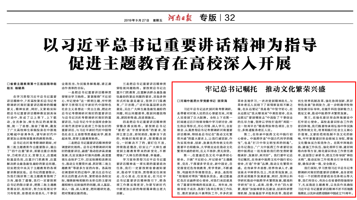 编者按:近日,《河南日报》对我校党委书记别荣海在省委第十三巡回指导组7所高校贯彻落实习近平总书记考察调研河南重要讲话精神学习交流会上的发言《牢记总书记嘱托 推动文化繁荣兴盛》进行报道,现将全文刊发如下: