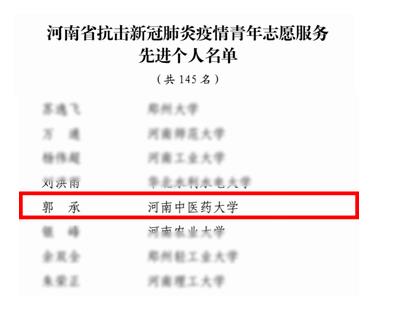本网讯(文/图 郭薇)近日,共青团河南省委、河南省青年志愿者协会下发文件,公布河南省抗击新冠肺炎疫情青年志愿者服务先进个人名单,我校第三附属医院团委副书记郭承同志荣获“河南省抗击新冠肺炎疫情青年志愿者服务先进个人”称号。