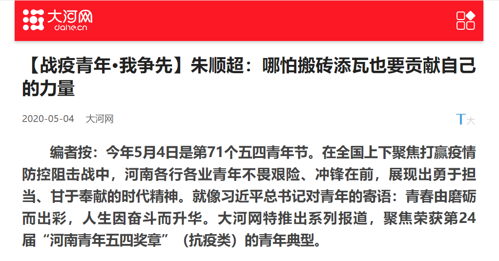 编者按:2020年5月4日,大河网对我校优秀学子朱顺超的援建河南“小汤山”医院事迹进行报道。现将全文刊发如下: