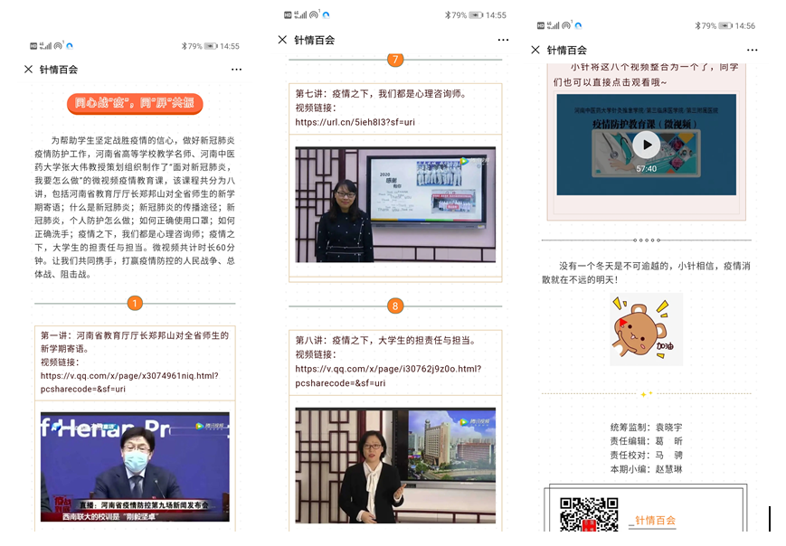 本网讯(文图/岳颀)日前,学校下发了《2020年春季返校开学前思想政治教育工作方案》(河中医学函〔2020〕1号),在学工部的统一组织下,各院部在认真贯彻落实党中央、国务院防疫工作部署的同时,将疫情防控和思想政治教育工作相结合,坚持育人导向、挖掘育人元素,把共同抗击疫情斗争作为思想政治教育的重要实践和生动教材,把疫情危机作为教育契机,全力做好战“疫”期间大学生思想政治教育工作。