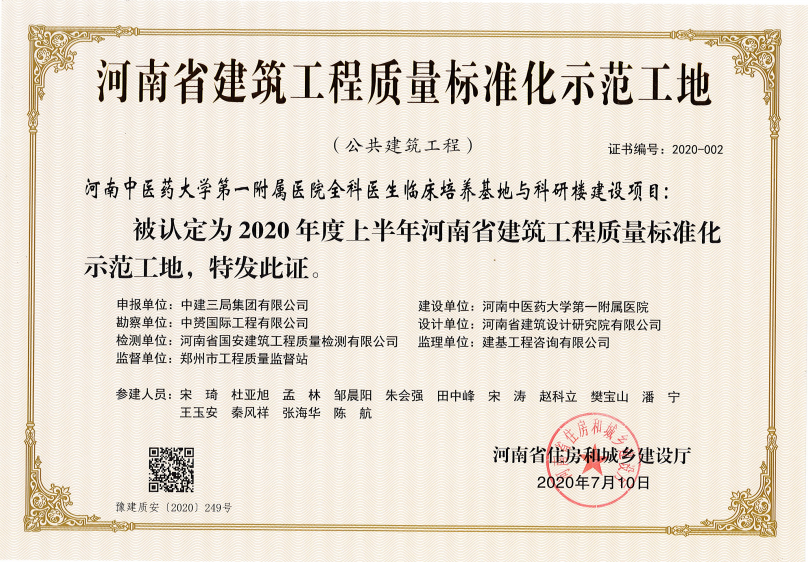 本网讯(文/图 尹梦溪)近日,我校一附院新院区全科医生临床培养基地与科研楼建设项目被河南省住建厅授予“2020年上半年河南省建筑工程质量标准化示范工地”荣誉称号。