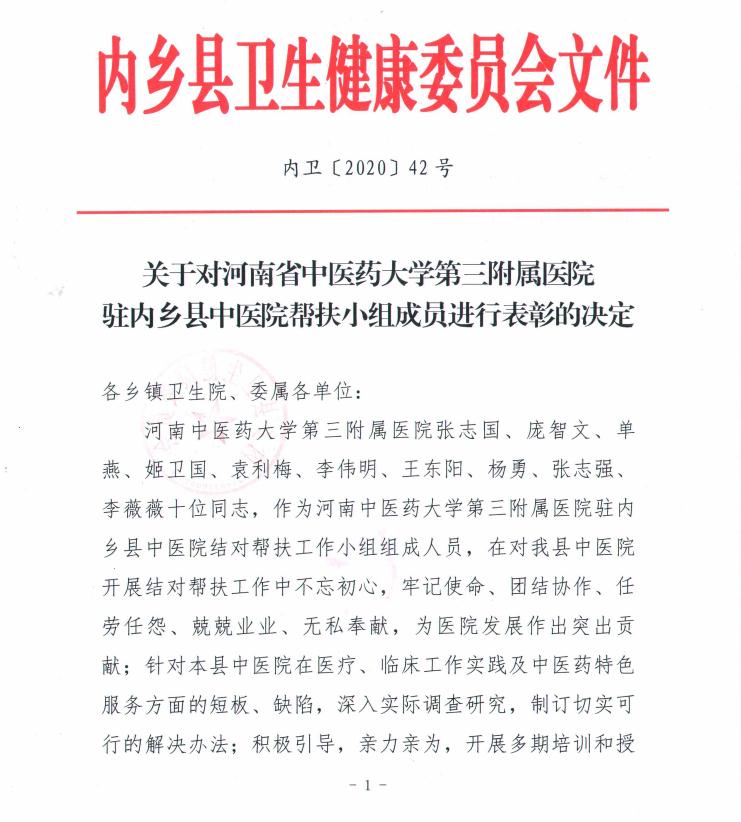 关于对河南省中医药大学第三附属医院驻内乡县中医院帮扶小组成员进行表彰的决定