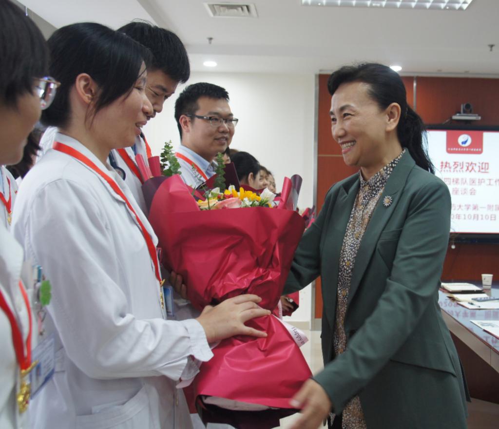 2020年10月10日,张婉红(右一)向医院第四批返岗的新冠隔离病区医护人员送上鲜花。