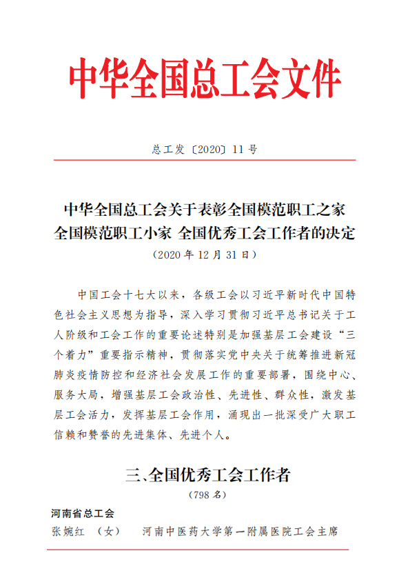编者按:近日,中华全国总工会下发了《关于表彰全国模范职工之家、全国模范职工小家、全国优秀工会工作者的决定》,一附院党委委员、工会主席张婉红荣获“全国优秀工会工作者”称号。2021年3月8日, 河南日报、顶端新闻等媒体对张婉红同志先进事迹进行了专题报道。报道内容发布如下: