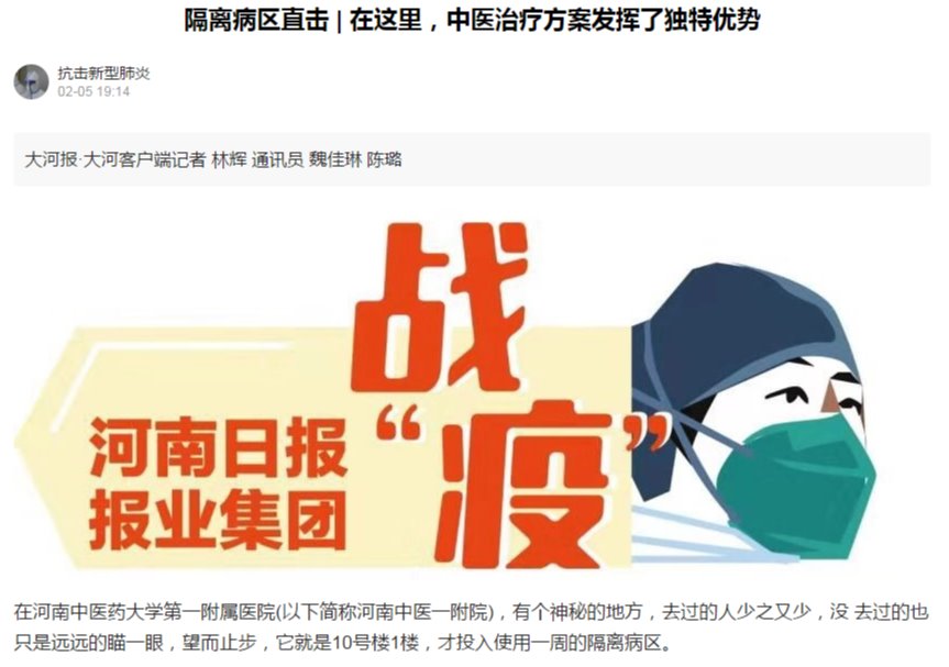 编者按:2020年2月5日,大河客户端对我校一附院积极发挥中医药优势,拟定防治新型冠状病毒感染的肺炎协定方进行广泛报道。现将全文刊发如下: