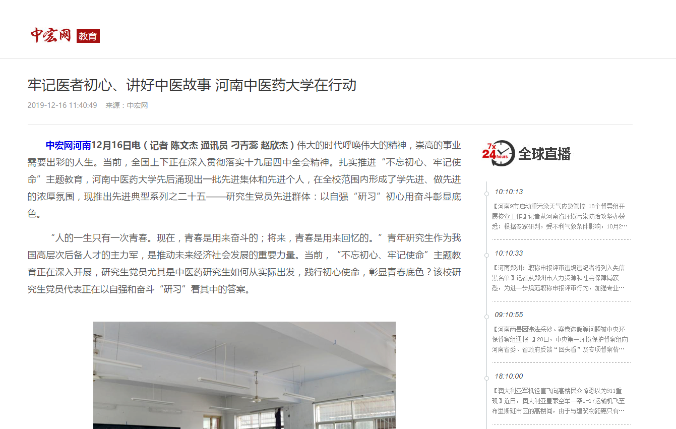 编者按:2019年12月13日,中宏网以《牢记医者初心、讲好中医故事 亚盈app(中国)官方网站在行动》为题,对我校研究生党员先进群体进行报道。现将全文刊发如下: