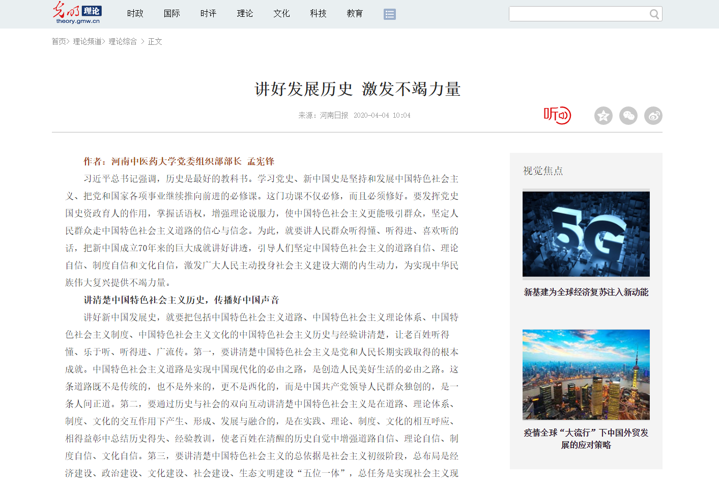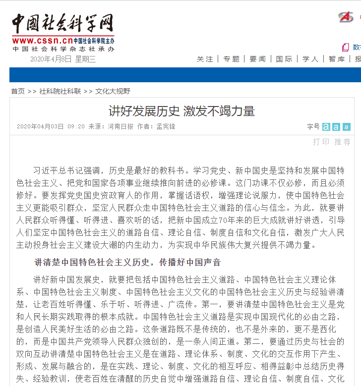 编者按:近日,光明网、中国社会科学网、《河南日报》理论版对我校党委委员、组织部长孟宪锋的文章《讲好发展历史 激发不竭力量》进行报道。现将报道全文刊发如下: