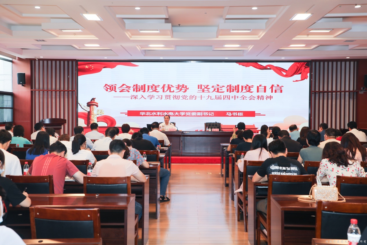 马书臣结合我国在新冠肺炎疫情防控工作中取得的积极成效,以《领会制度优势 坚定制度自信》为题,为我校辅导员从13个方面系统阐述了我国国家制度和国家治理体系的显著优势。