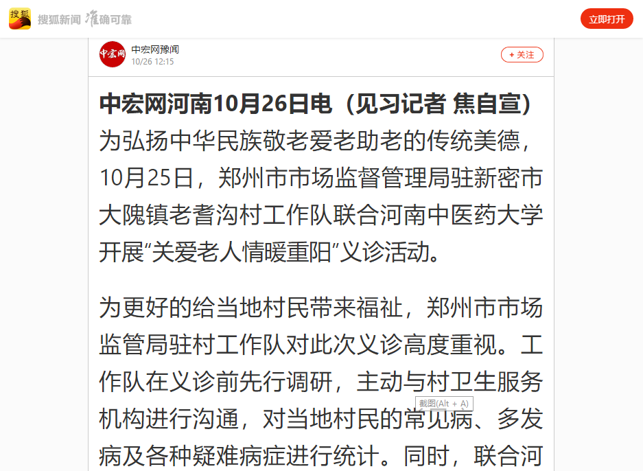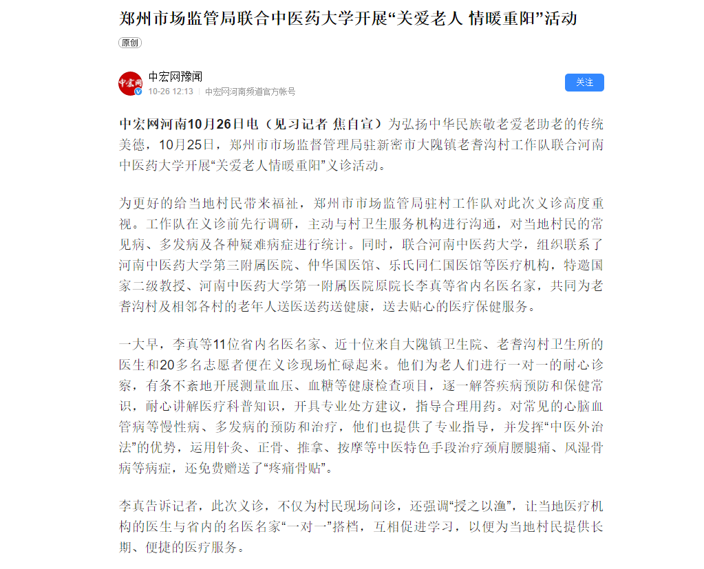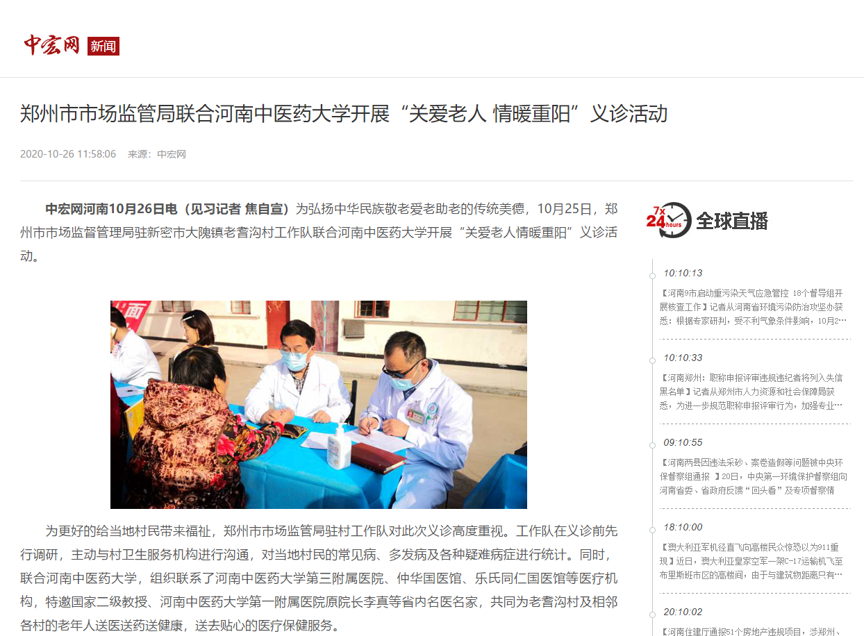 2020年10月26日,中宏网、今日头条、中宏网豫闻、搜狐新闻等媒体对郑州市市场监管局联合我校开展“关爱老人 情暖重阳”义诊活动进行报道。
