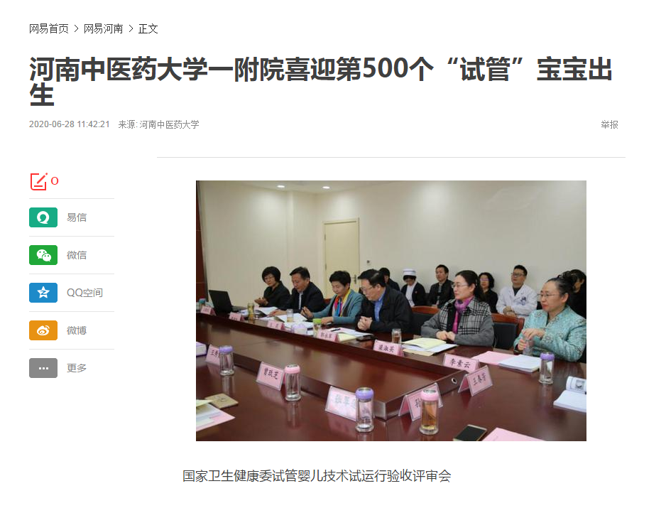 2020年6月28日,大河网、网易新闻对我校一附院喜迎第500个“试管”宝宝出生进行报道。