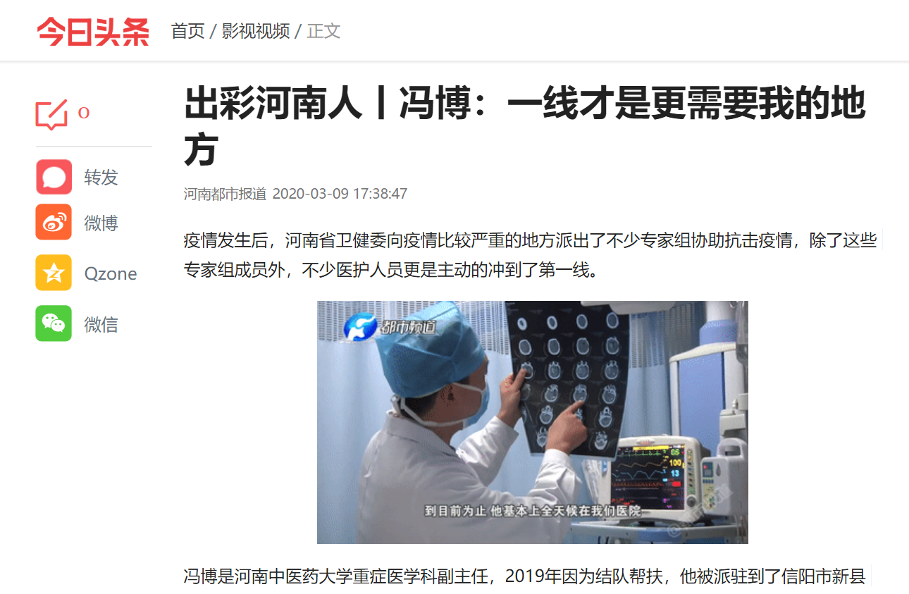 编者按:2020年3月9日,河南都市频道对我校“校地帮扶”专家冯博赴信阳新县援助疫情救治工作进行报道。现将全文刊发如下: