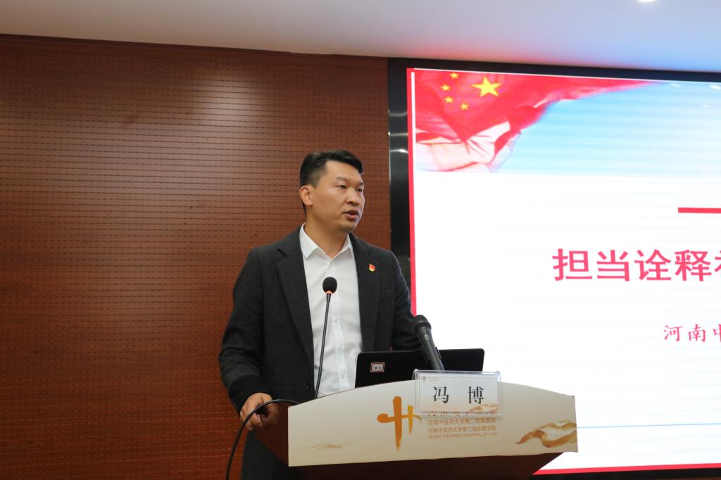 下午三点,宣讲报告会在雄壮的国歌声中开幕。二附院党委副书记张佩江在致辞中,为疫情期间坚守岗位、默默付出的“最美中医人”点赞。他表示,党的十九届五中全会胜利闭幕,开启了全面建设社会主义现代化的新征程、新伟业,为医院和学校制定“十四五”发展规划明确了目标,指引了方向。我们要把学习贯彻十九届五中全会精神与弘扬伟大抗疫精神和落实立德树人根本任务结合起来,在全面学习领悟伟大抗疫精神过程中,为学校转型发展奠定坚实基础。张佩江表示,学校党委精心组织由抗疫英雄组成的宣传报告团,在全校范围内开展12场“杏林丹心 致敬英雄”抗疫先进事迹宣讲报告会,旨在弘扬伟大抗疫精神、凝聚团结奋进力量。通过广泛宣传抗疫斗争中学校涌现出的先进人物和典型事迹,持续深化“把灾难当教材、与祖国共成长”教育活动,希望大家在聆听抗疫故事,回忆抗疫艰难岁月的过程中,全面学习、深刻领悟伟大抗疫精神,向抗疫英雄学习,在致敬英雄中,积极奋进,砥砺向前,为学校、医院更好的建设和发展做出更大贡献。他强调,各党支部、各科室要以此次报告会为契机,采取形式多样的学习研讨活动,持续弘扬伟大抗疫精神,凝聚团结奋进力量。