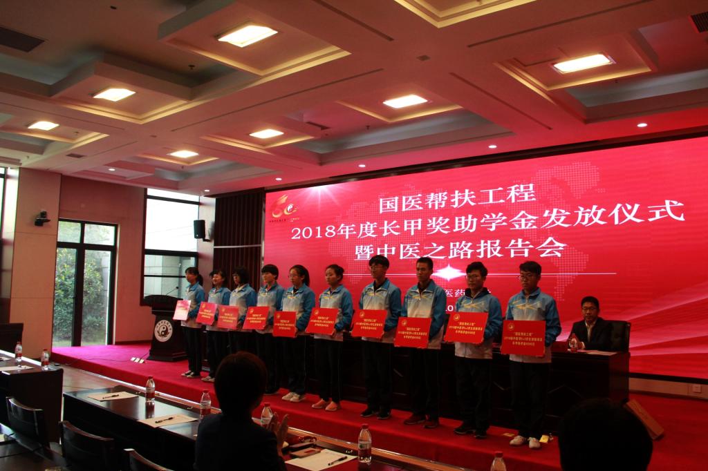2018年10月18日,长甲奖助学金发放仪式暨中医之路报告会在图书馆第二报告厅举行,210名优秀贫困学子获得资助。我校杰出校友、长甲集团国际控股有限公司董事局主席赵长甲、集团有关领导,校长许二平、党委副书记郭德欣,相关部门单位负责人及受助学生代表参加活动。活动由郭德欣主持。