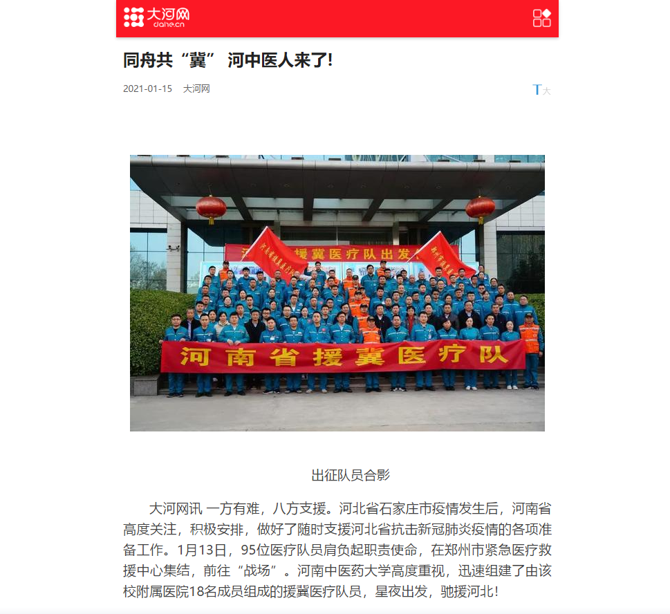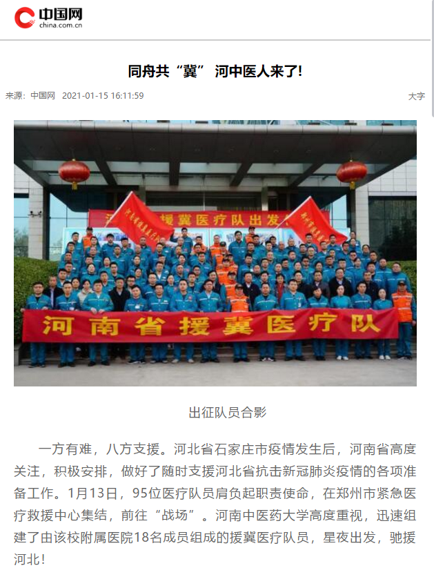 2021年1月15日,中国网、大河网、网易新闻等多家媒体对我校18名援冀医疗队员出征河北进行报道。