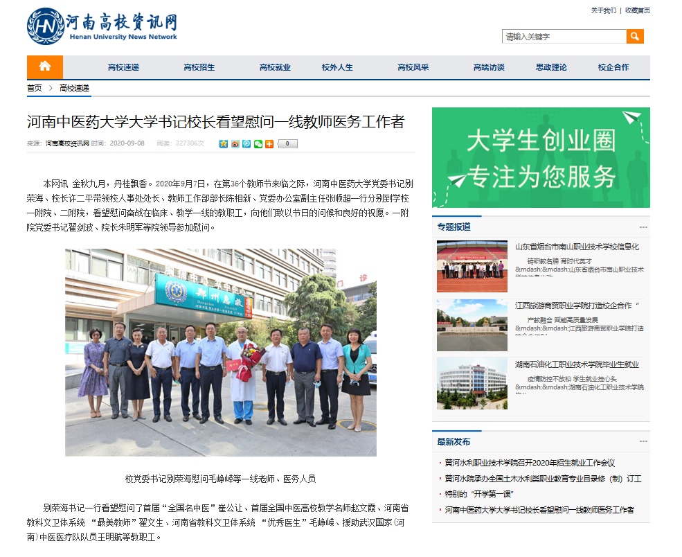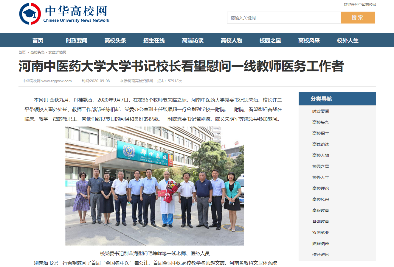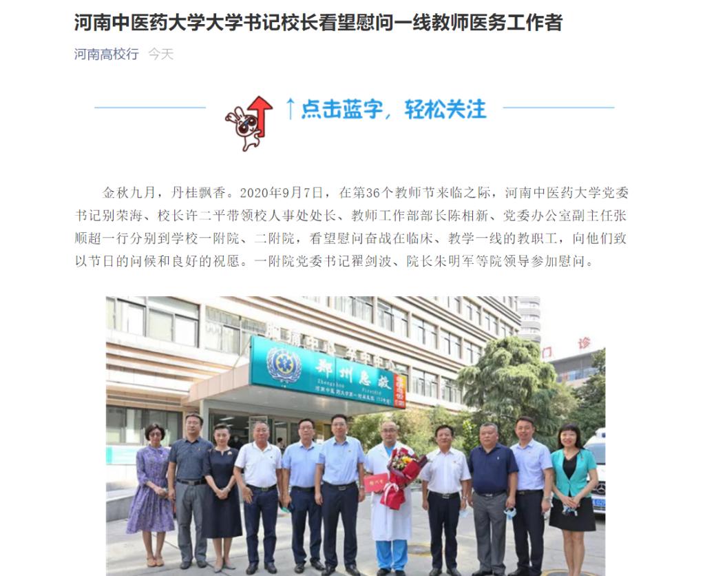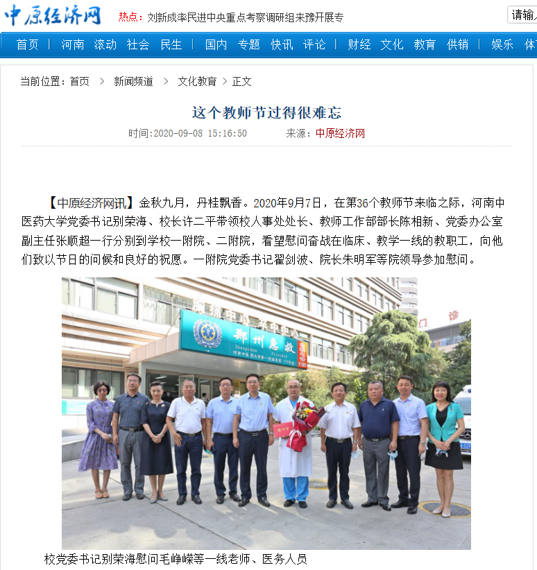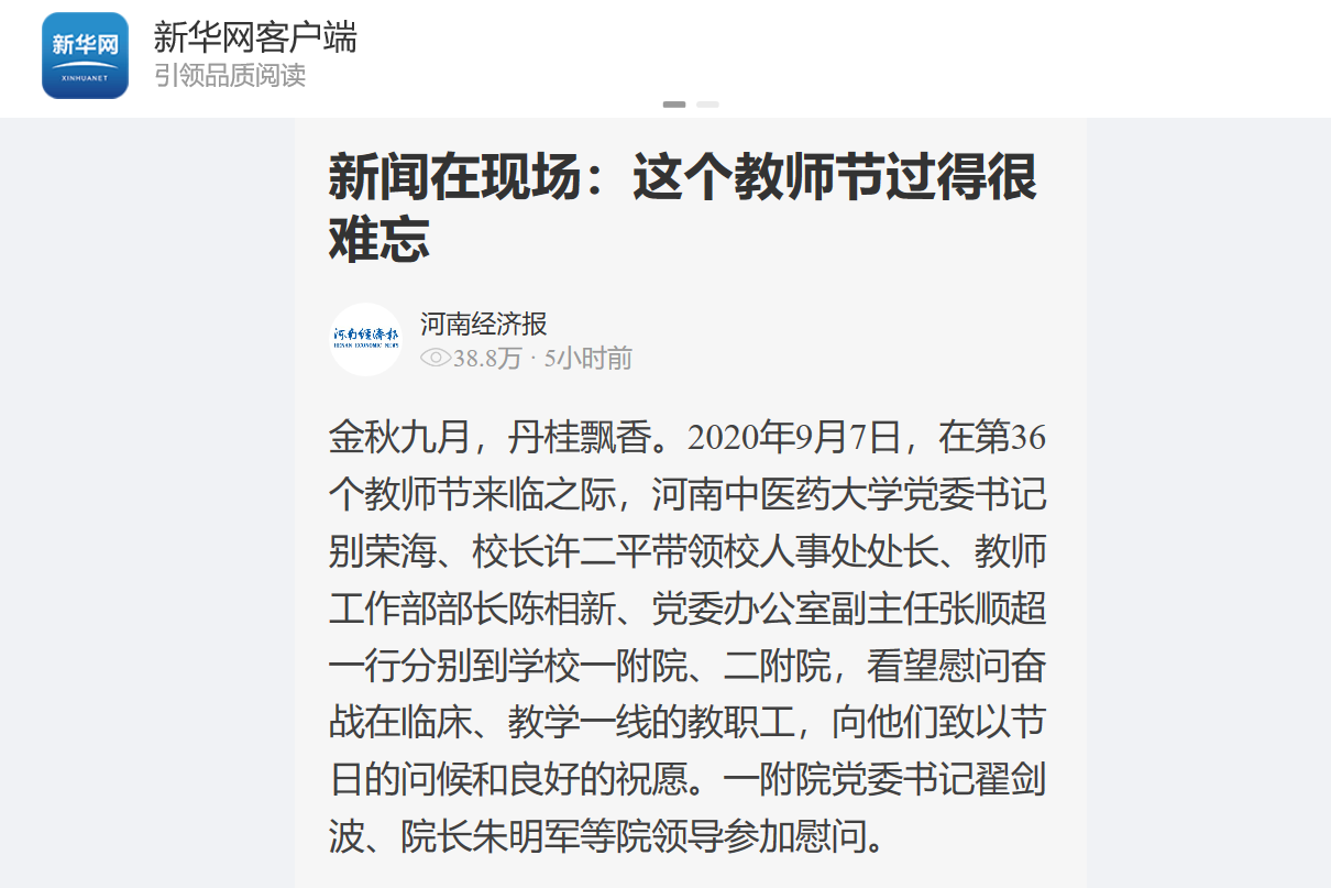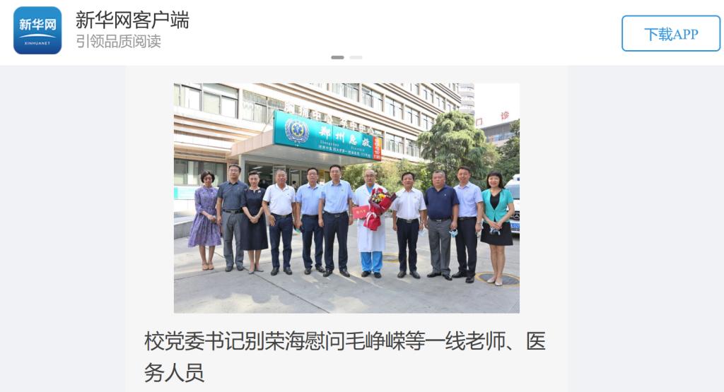 编者按:2020年9月8日,新华网、人民日报、中国网、大河网、中新河南网、中华高校网、河南高校资讯网、河南高校行、新浪新闻、上游新闻、封面新闻、东方头条、中原经济网等多家媒体对我校党委书记别荣海、校长许二平慰问一线教职工进行报道。