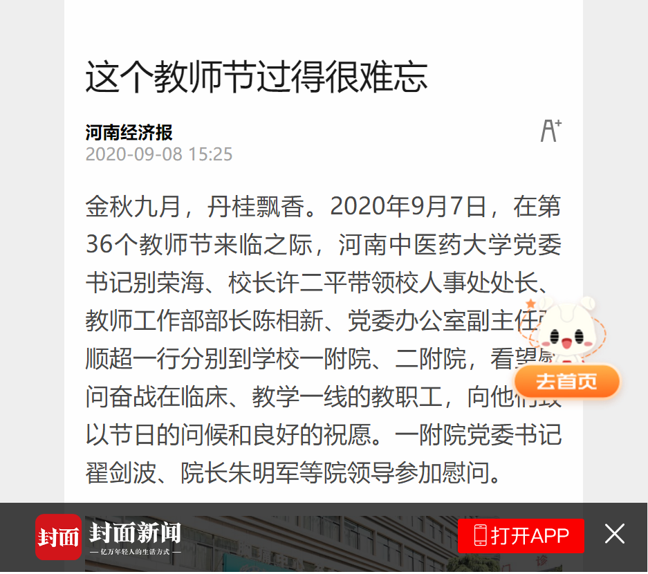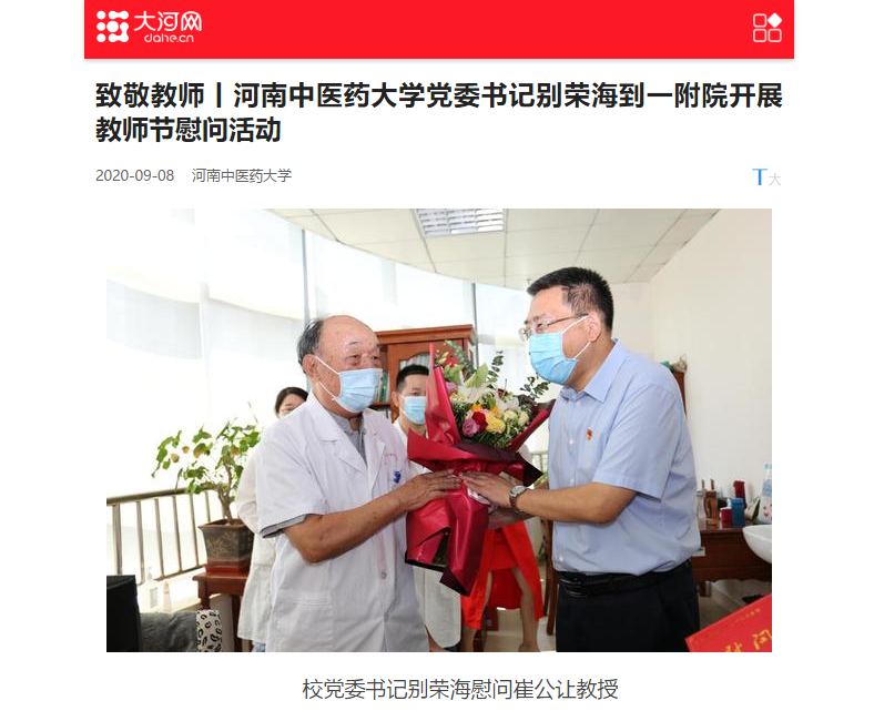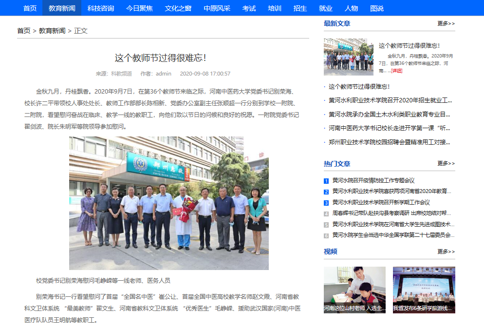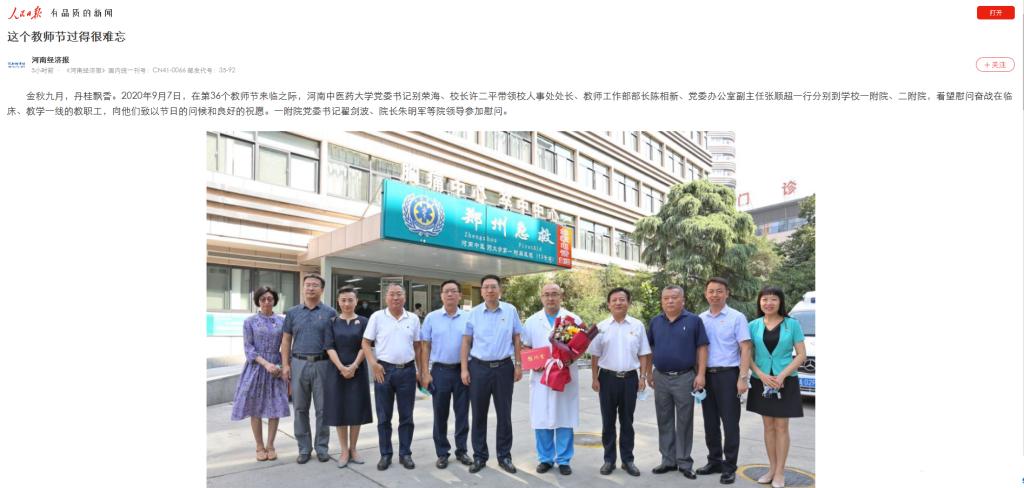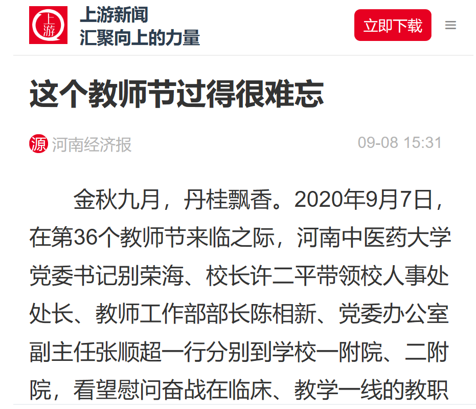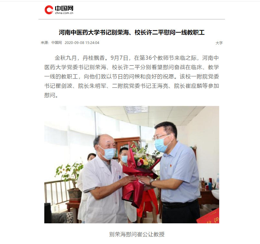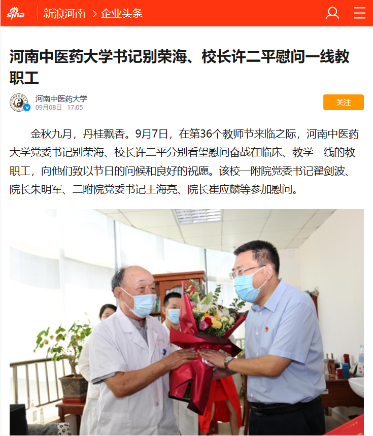 编者按:2020年9月8日,新华网、人民日报、中国网、大河网、中新河南网、中华高校网、河南高校资讯网、河南高校行、新浪新闻、上游新闻、封面新闻、东方头条、中原经济网等多家媒体对我校党委书记别荣海、校长许二平慰问一线教职工进行报道。