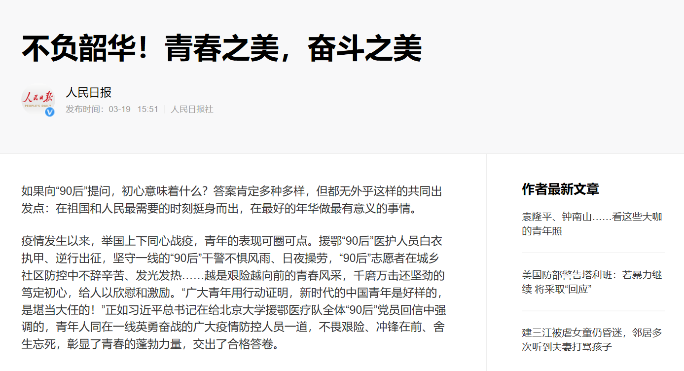 疫情发生以来,举国上下同心战疫,青年的表现可圈可点。援鄂“90后”医护人员白衣执甲、逆行出征,坚守一线的“90后”干警不惧风雨、日夜操劳,“90后”志愿者在城乡社区防控中不辞辛苦、发光发热……越是艰险越向前的青春风采,千磨万击还坚劲的笃定初心,给人以欣慰和激励。“广大青年用行动证明,新时代的中国青年是好样的,是堪当大任的!”正如习近平总书记在给北京大学援鄂医疗队全体“90后”党员回信中强调的,青年人同在一线英勇奋战的广大疫情防控人员一道,不畏艰险、冲锋在前、舍生忘死,彰显了青春的蓬勃力量,交出了合格答卷。