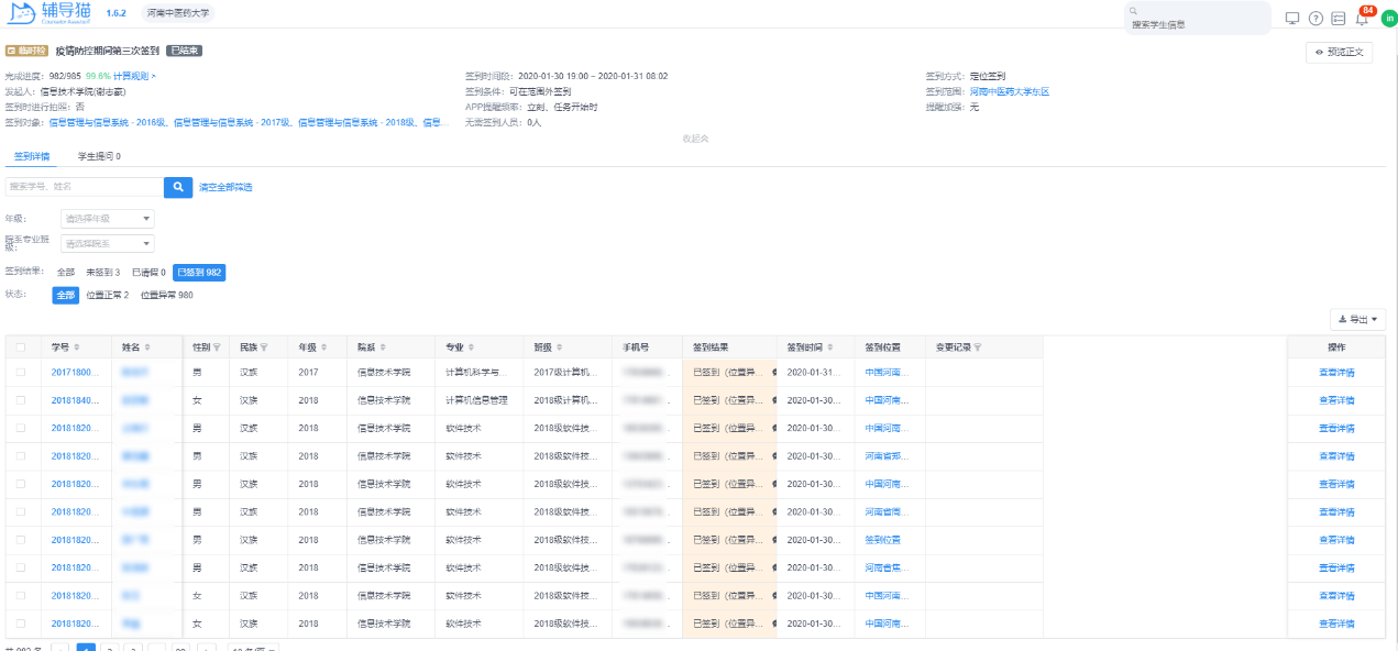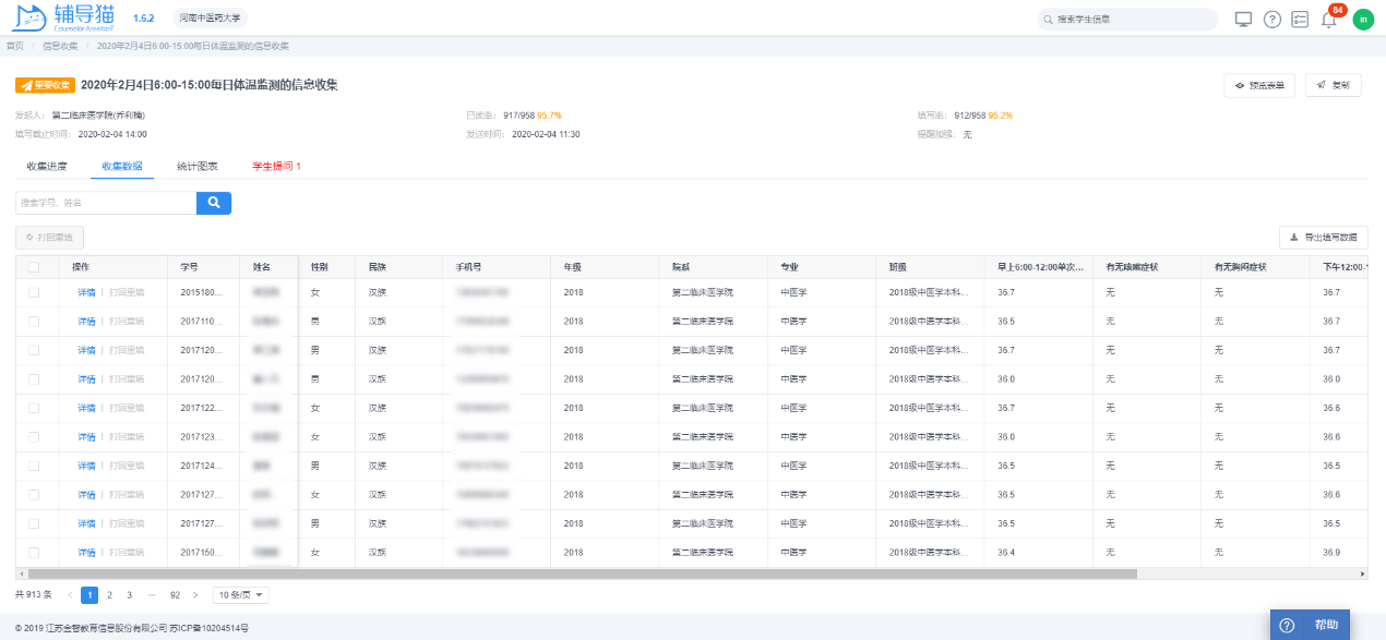 我校于2月1日启动该项服务,全校19633名本专科学生和1915名研究生通过手机每天两次上报体温情况,实时掌握学生健康状况,使用首日学生上报率超过99.6%。学校疫情防控领导小组通过后台及时掌握学生健康动态,疑似情况重点关注,一目了然,方便学校及时应对处理。