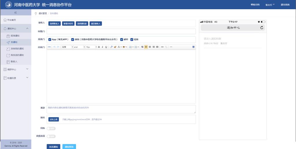 我校智慧校园提供的统一消息协作平台,校内各部门、各院系辅导员等都可以利用通过统一消息协作平台,通过短信、微信、APP、邮件等多种渠道进行消息的精准推送。