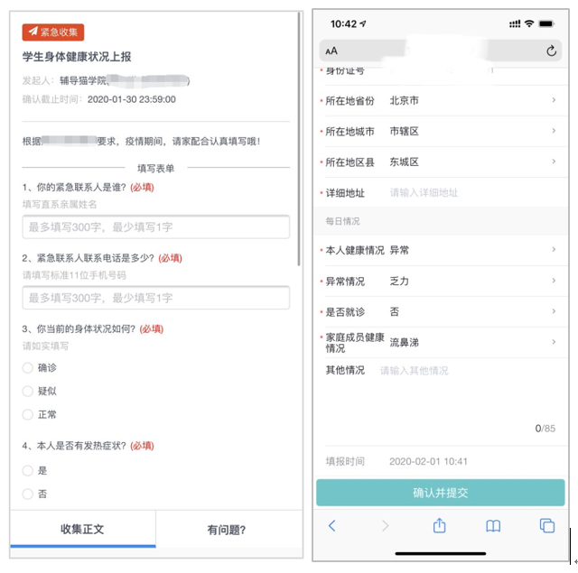针对湖北等疫情严重地区,智慧校园平台做到自动化、高频次、全维度的疫情信息采集,实现深度管控。学工部使用该服务发布疫情调研任务,学生在手机上收到提醒,根据健康信息、历史出行记录、预计返校时间等预置模板内容填报,并且上传实时地理位置。