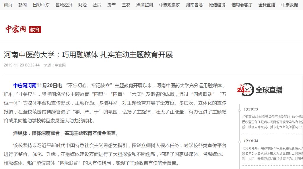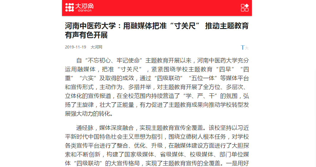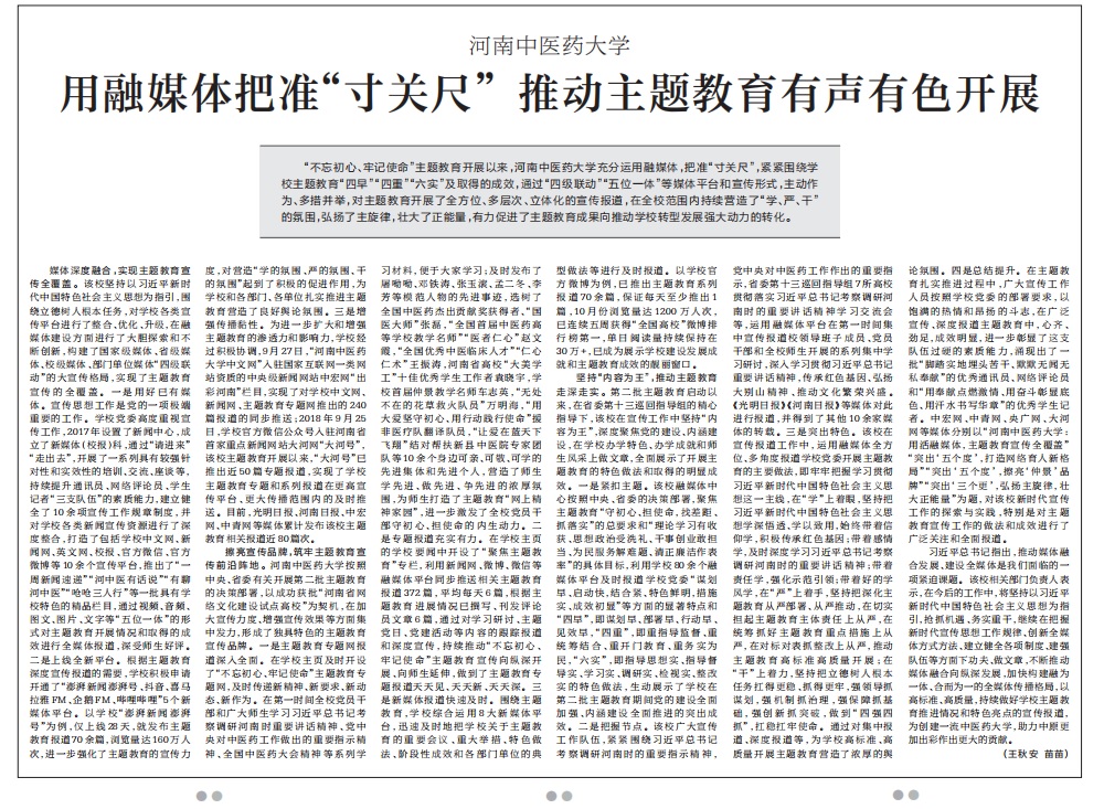 编者按:2019年11月19日-20日,《河南日报》、中宏网、大河网以《亚盈app(中国)官方网站:用融媒体把准“寸关尺” 推动主题教育有声有色开展》为题,对我校主题教育开展情况进行报道。现将全文刊发如下: