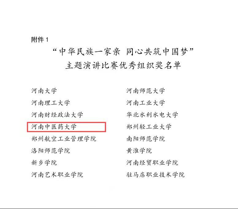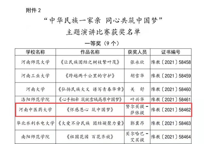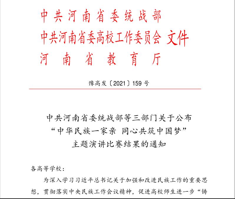 “中华民族一家亲 同心共筑中国梦”主题演讲比赛由中共河南省委统战部、中共河南省委高校工委、河南省教育厅主办,旨在以此次活动为契机,全面贯彻落实党和国家的民族政策,积极推进民族团结进步事业,充分调动和发挥各民族师生的积极性、主动性和创造性,坚持立德树人根本任务,铸牢中华民族共同体意识。比赛历时两个月,经过校内初赛、全省复赛、全省决赛三个环节,我校学生努尔买提·萨依提最终从100多名选手中脱颖而出。此次演讲比赛全省共评出个人一等奖9名,二等奖11名,三等奖10名,16所高校荣获“优秀组织奖”。