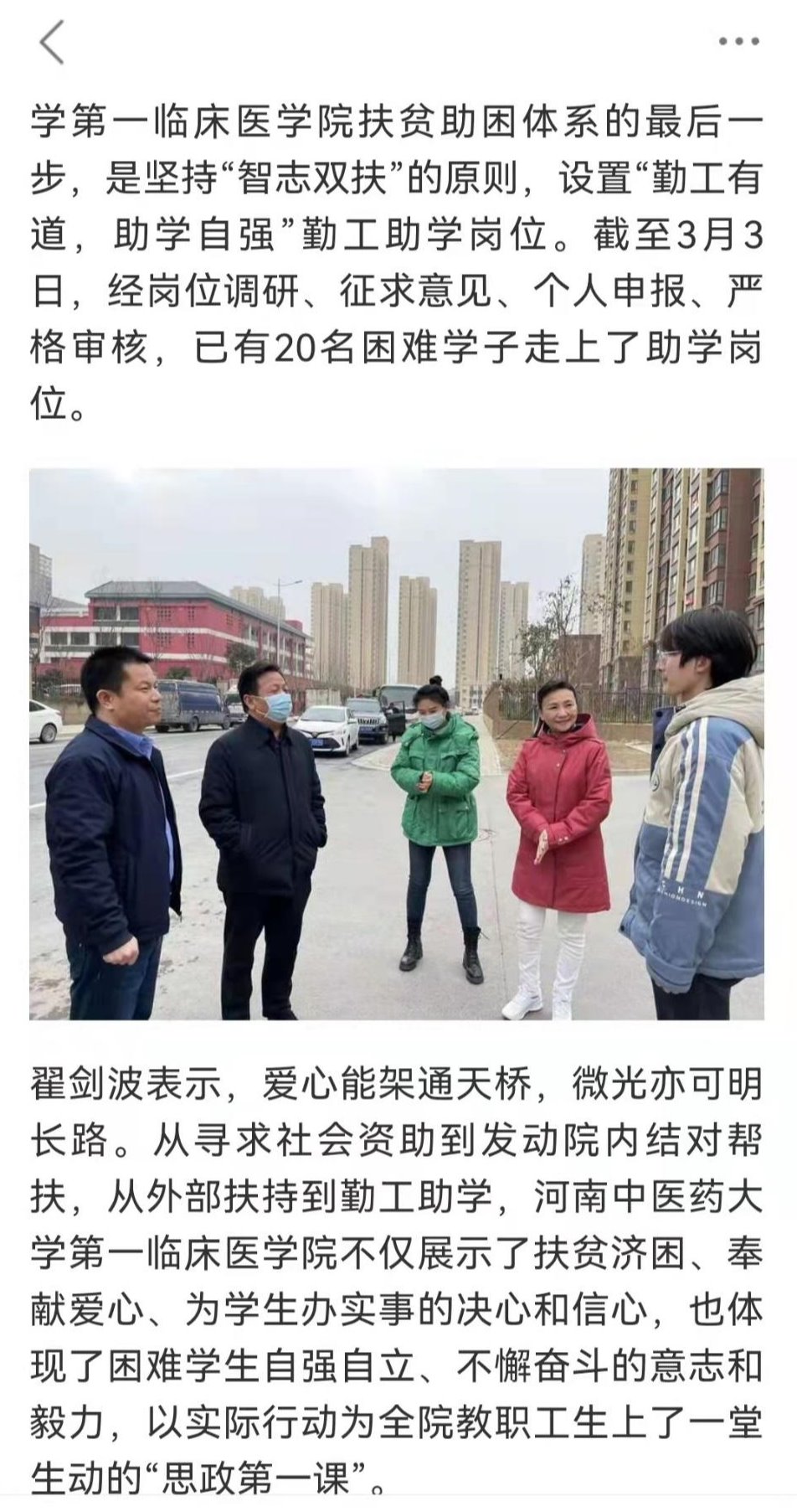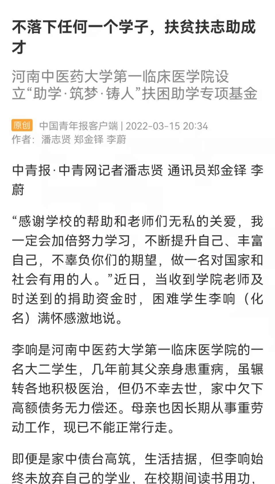 编者按:2022年以来,一附院第一临床医学院党委坚持精准发力,把学生资助、服务和育人工作深度融合,着眼于扶贫扶志助力成才,建立完善了"寻求外来资金帮扶""开展内联基层党支部(科室)帮扶""自立自强勤工俭学帮扶"三方联动的扶贫助困机制。近日,中国青年报对一临床“扶贫扶志助成才”事迹进行了报道。